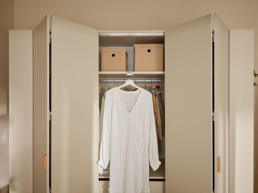 - Przesuwane drzwi szafy składają się jak harmonijka. Dzięki temu wszystkie ubrania i akcesoria są zawsze pod ręką. W drzwiach zamontowany jest system cichego domyku.