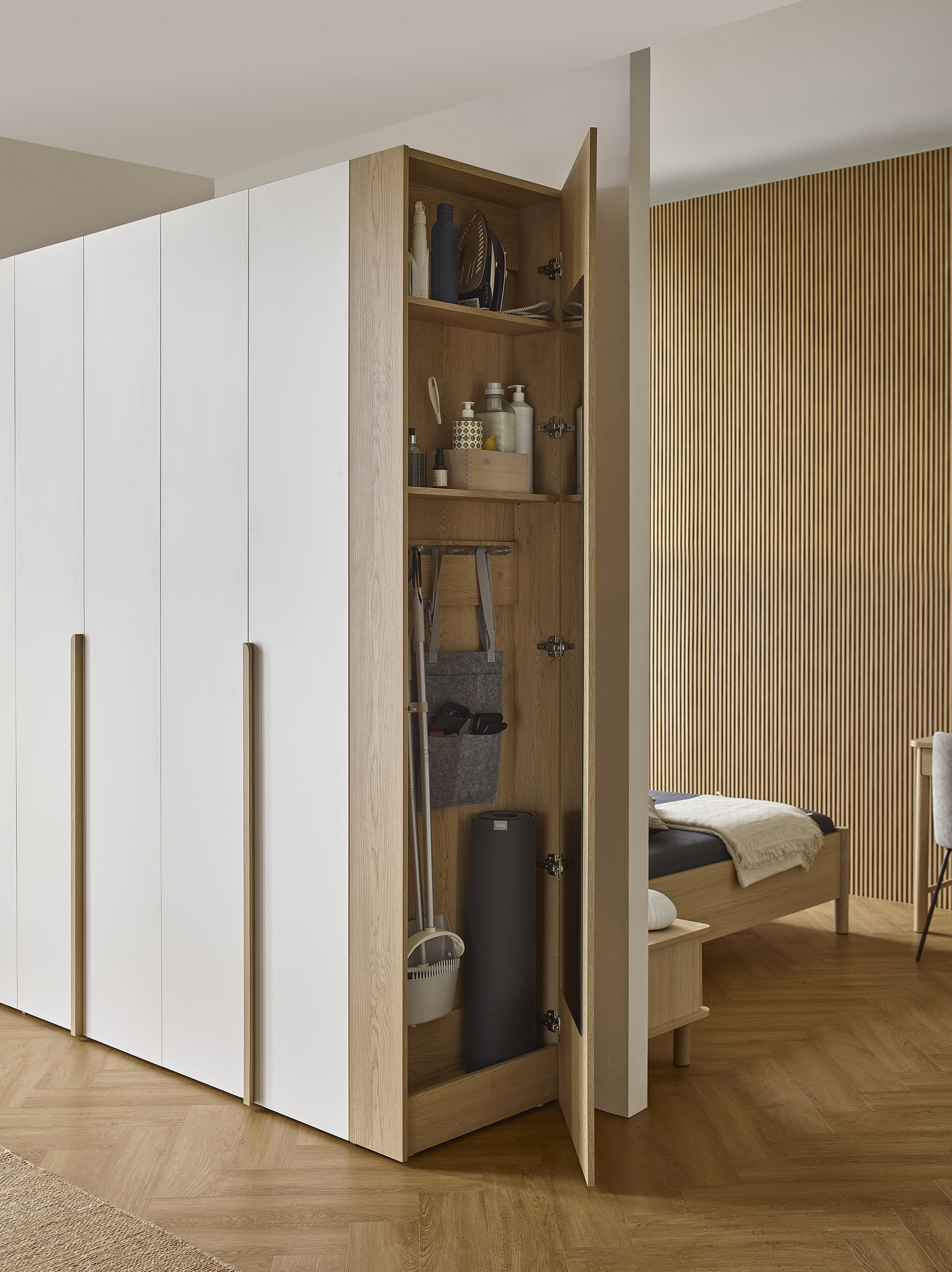 Szafa boczna z kolekcji Stor umożliwia łatwe zwiększenie pojemności głównej szafy i praktyczne wykorzystanie jej bocznej przestrzeni. Oferuje dodatkowe miejsce na modowe dodatki lub akcesoria do prasowania czy sprzątania. Zawiera praktyczne półki i lustro. Jej wykończenie możesz dopasować do wystroju.