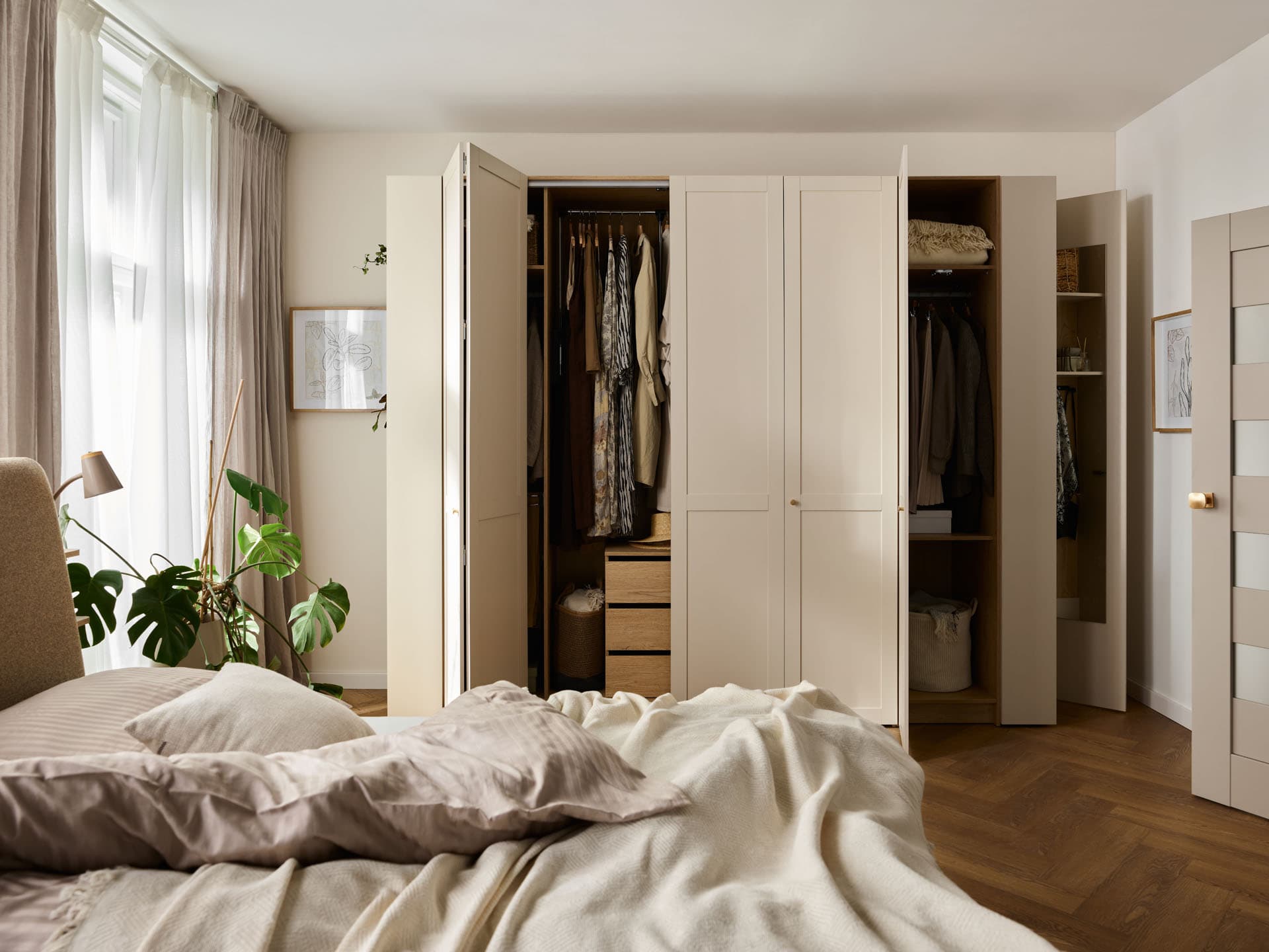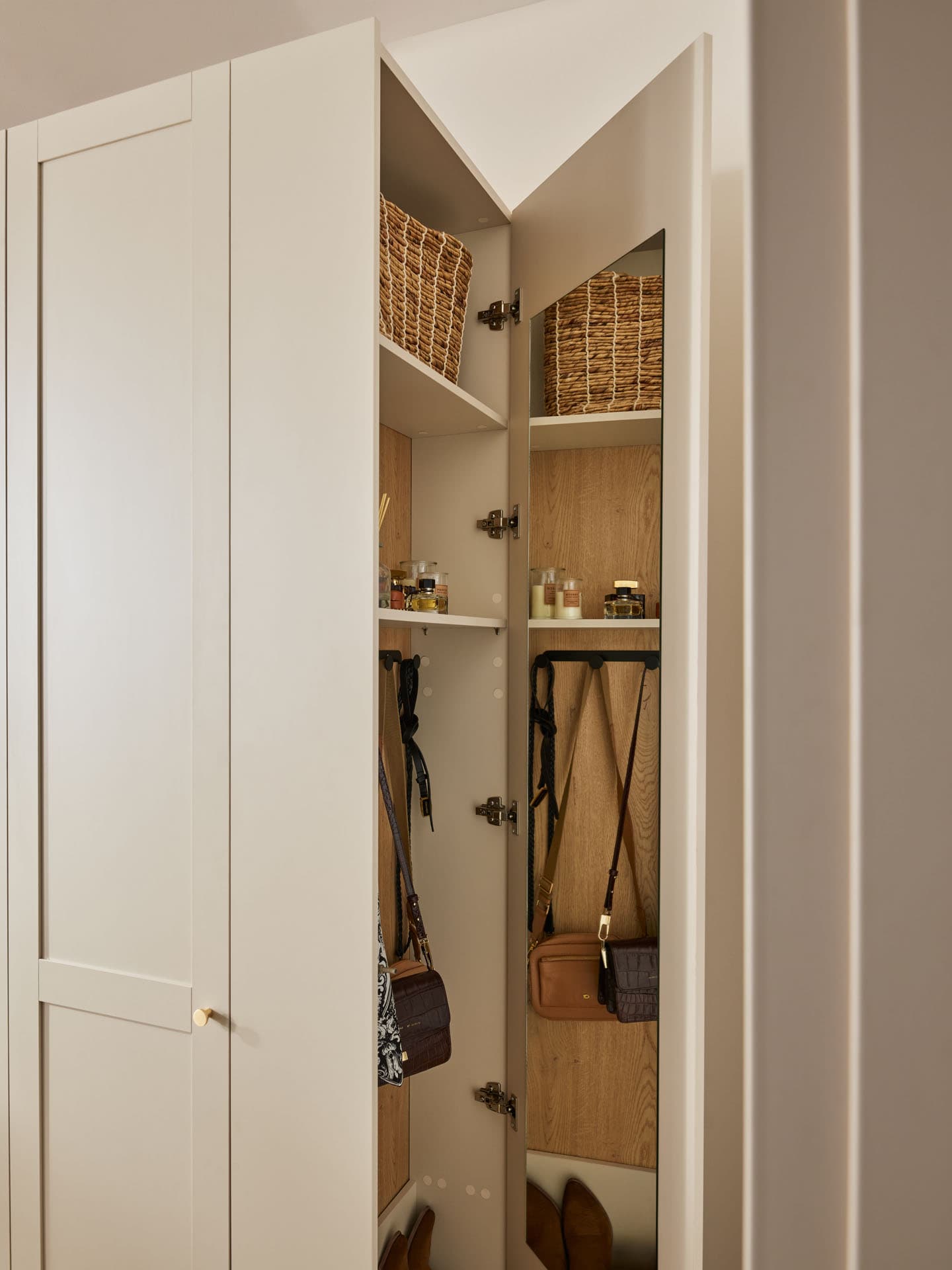 Szafa boczna Stor zwiększa funkcjonalność całej zabudowy, oferując dodatkową przestrzeń do przechowywania. Pomieści zarówno modowe dodatki, jak i domowe akcesoria, sprzęt do prasowania, a także plecaki czy deskorolki, sprawdzając się również w pokojach młodzieżowych. Jej wykończenie można dobrać tak, by idealnie współgrało z wystrojem wnętrza lub ciekawie z nim kontrastowało. To świetna alternatywa dla mebli na wymiar!