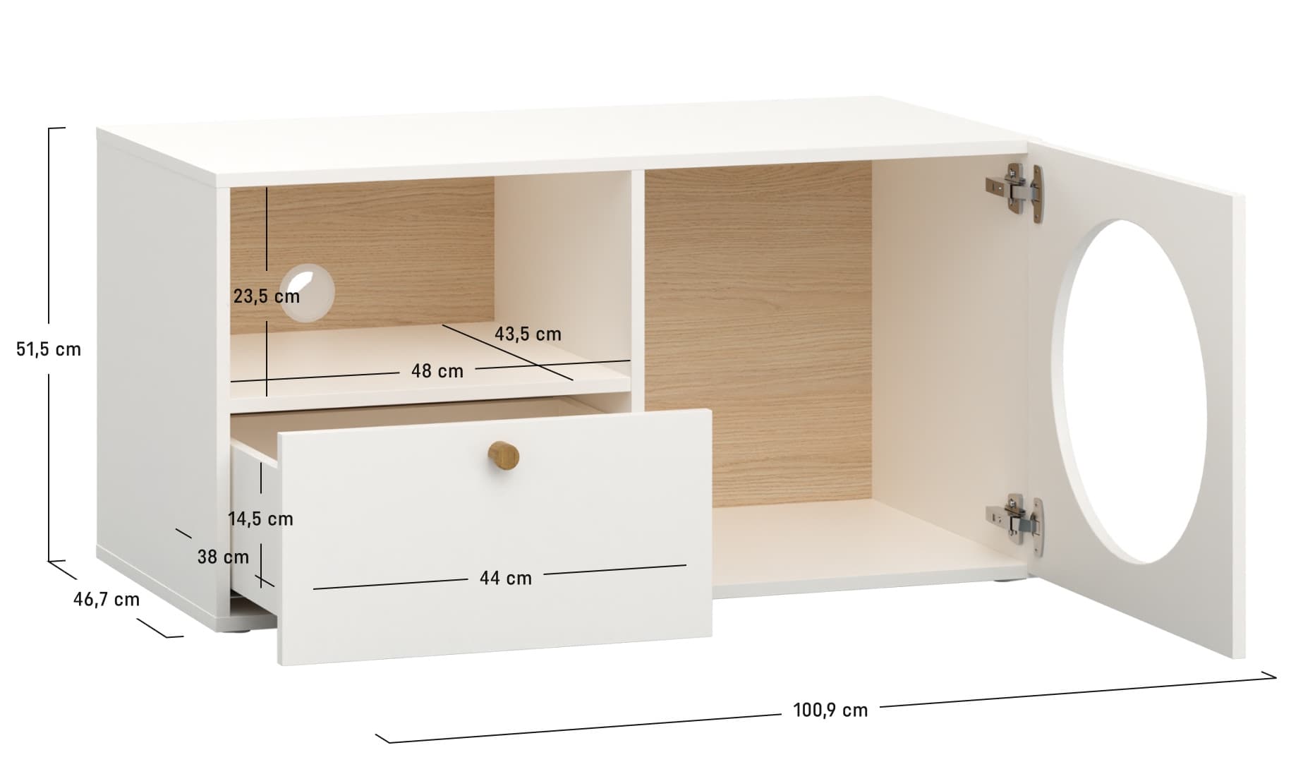 - Szafka RTV składa się z 1 szuflady, otwartej wnęki z przepustem na kable oraz przestrzenią zamkniętą frontem z otworem.