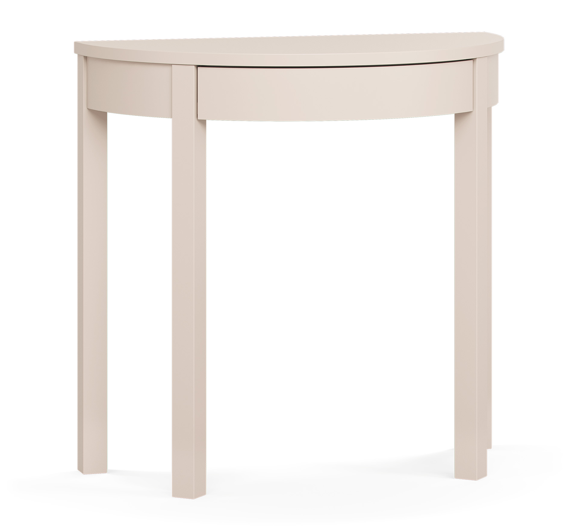 Toaletka Simple to niewielki mebel o wszechstronnym zastosowaniu. Jej blat ma kształt półokręgu, dzięki czemu można ją wygodnie ustawić przy ścianie. Zawiera małą szufladę do przechowywania podręcznych przedmiotów. Toaletkę można łatwo dopasować do aranżacji – jest dostępna w 4 kolorach do wyboru.