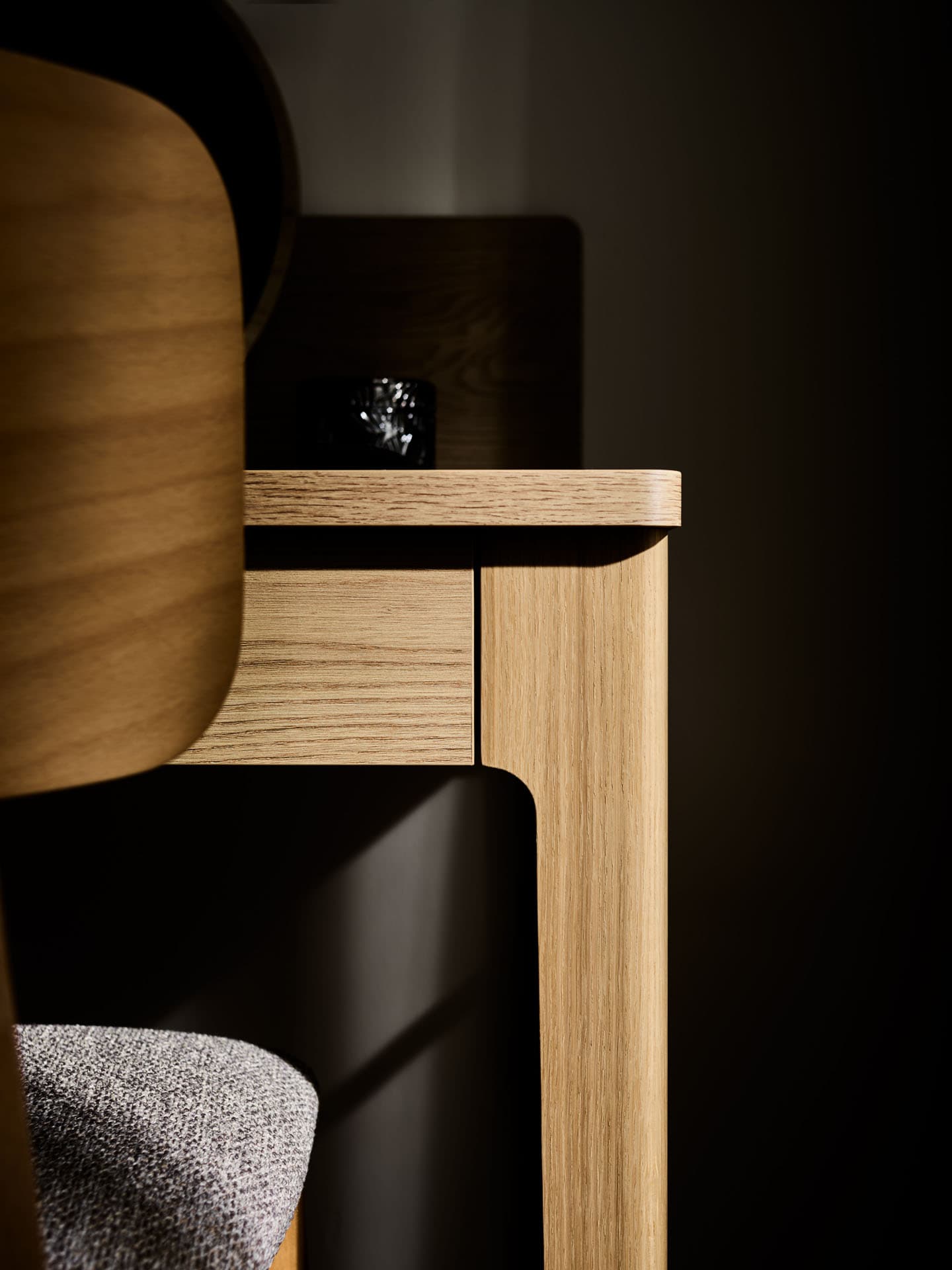 Toaletka z kolekcji Well to mebel, który pozwala zwolnić tempo i sprawia, że chwile przed lustrem stają się przyjemnym rytuałem. Ciepły odcień dębu, miękko wyprofilowane krawędzie blatu i solidny, drewniany stelaż budują atmosferę harmonii i komfortu. Przemyślany zestaw pozwala zachować porządek na blacie i wygodnie przechowywać kosmetyki oraz akcesoria do makijażu.
