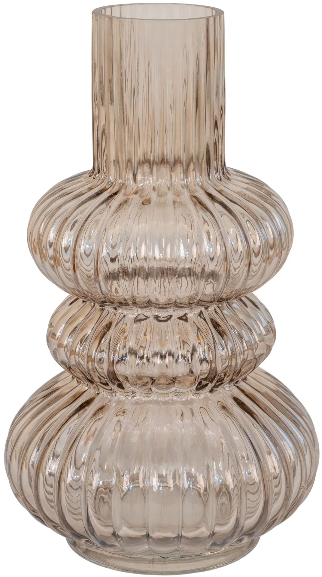 Wazon Eclipse ze szkła w ciekawej kolorystyce urzeka trójdzielną, zaobloną formą z delikatnymi pionowymi żłobieniami, które nadają mu wyjątkową teksturę i charakter.