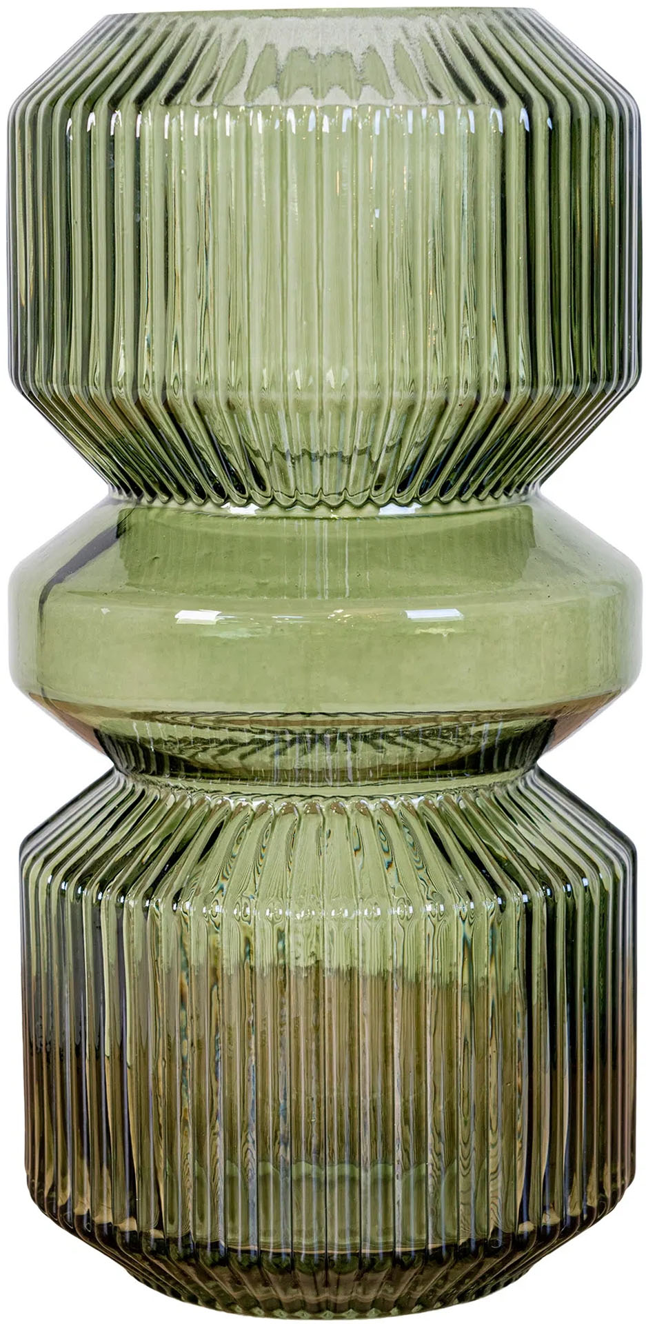 Wazon Flora ze szkła w kolorze oliwkowej zieleni zachwyca wyrafinowaną formą klepsydry z pionowymi żłobieniami, które tworzą interesującą grę światła i cienia.