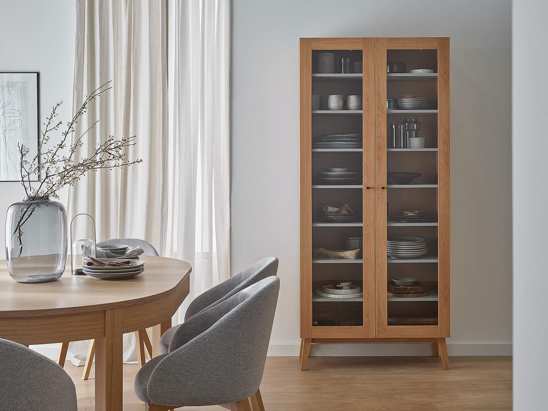 - Witrynę ustawisz na jednych spośród 9 nóg i stelaży wykonanych z drewna lub metalu. Możesz wybierać między wysokimi nóżkami, a także postawić na niskie ślizgacze, które utrzymają mebel tuż nad podłogą.