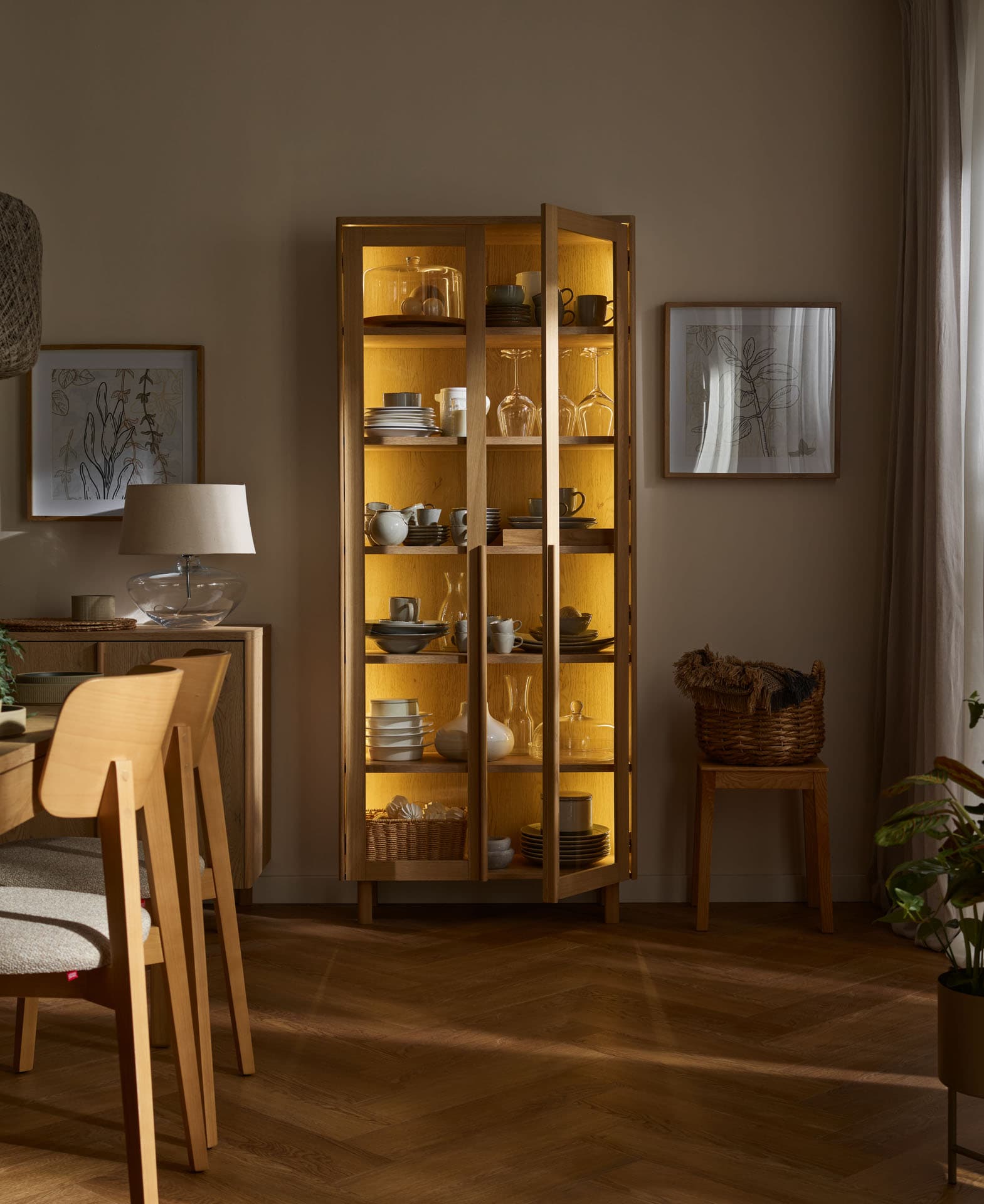 Witryna szeroka Well łączy funkcję przechowywania z estetyczną ekspozycją i wprowadza do wnętrza poczucie spokoju oraz uporządkowanej przestrzeni. Przeszklone fronty nadają bryle lekkości, a ciepło drewna i wyważone proporcje sprawiają, że witryna naturalnie wpisuje się w aranżację salonu lub jadalni. Charakter mebla budują dopracowane detale i naturalne materiały.
