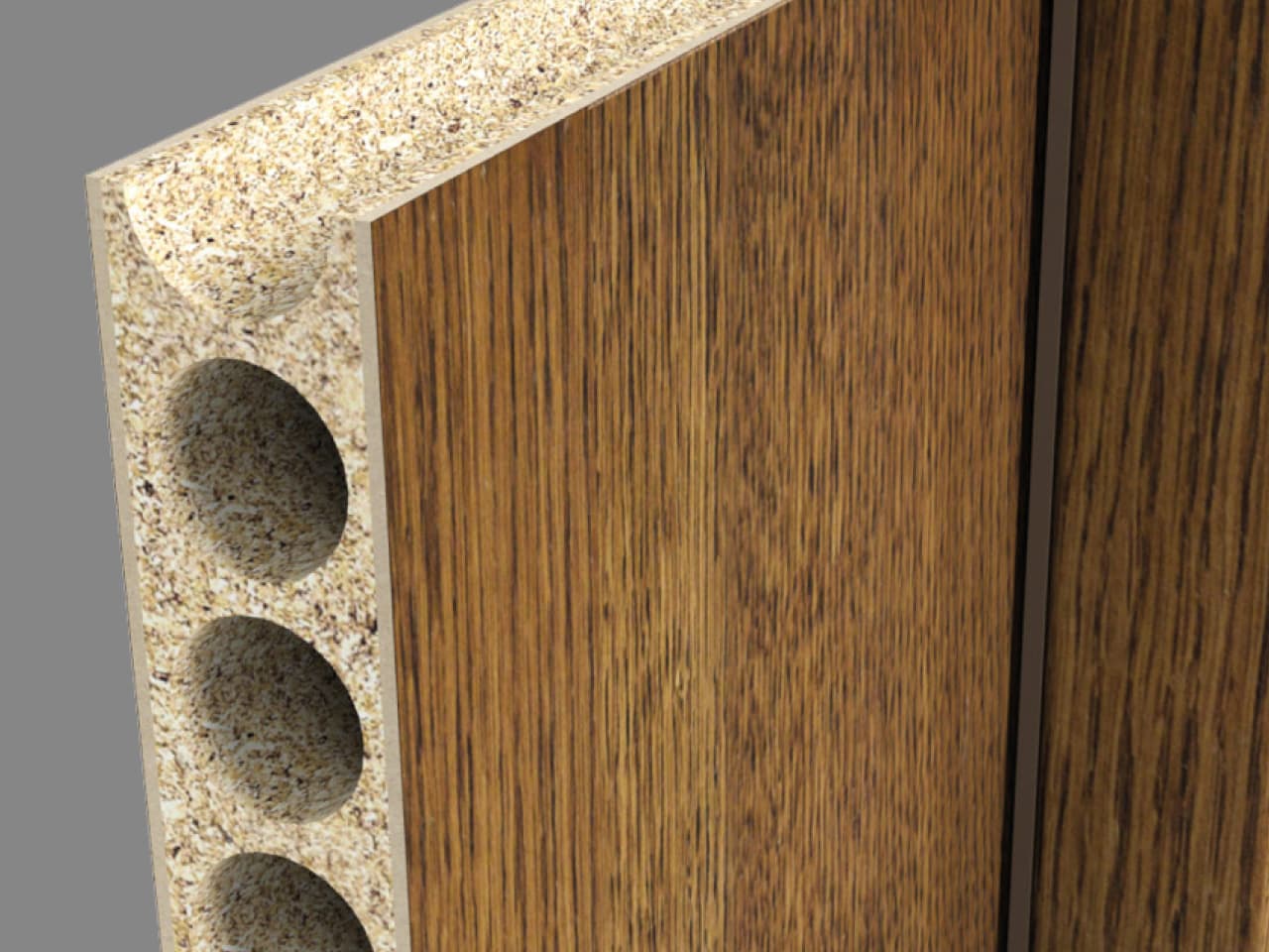 Drzwi Matto wypełnione są otworowaną płytą wiórową, która poprawia stabilność skrzydła oraz znacząco podwyższa parametry akustyczne. Dzięki temu drzwi są trwałe, skutecznie tłumią dźwięki i dobrze wyciszają.
