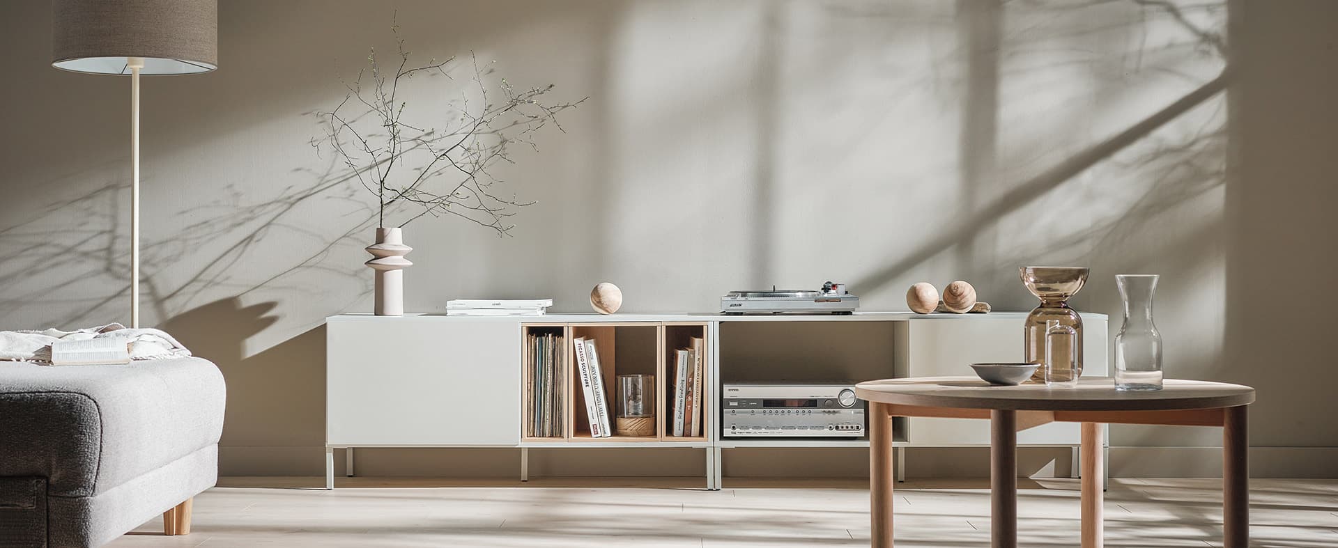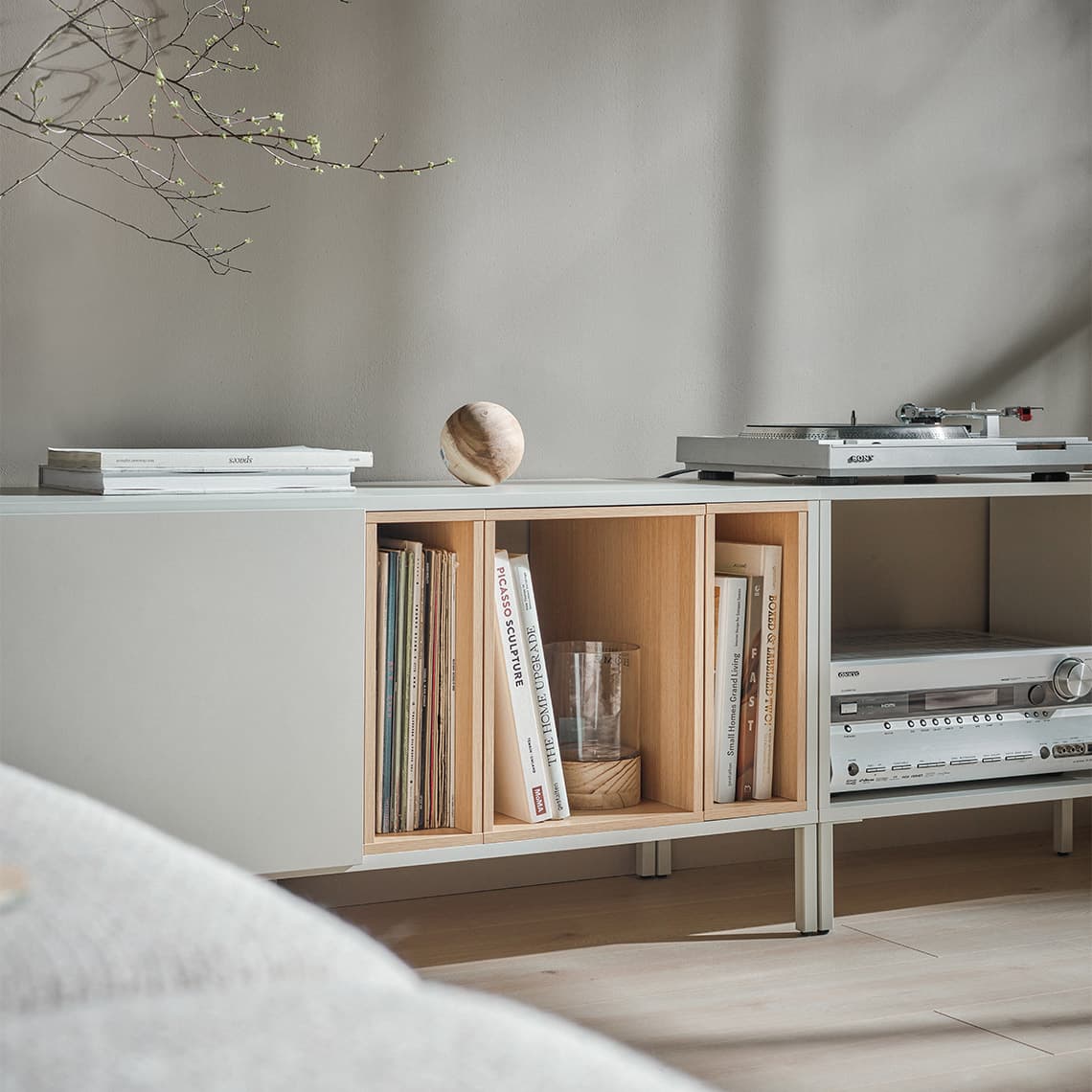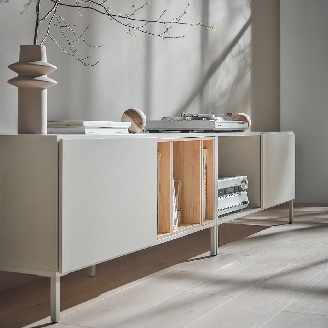 The Into system allows you to freely compose bookcases, chests of drawers and cabinets to suit your needs and different spaces. The intuitive system includes a cabinet, a set of legs and boxes (large and small) designed to organize open cabinet spaces. You can choose a ready-made configuration or design your own piece of furniture by combining individual elements.