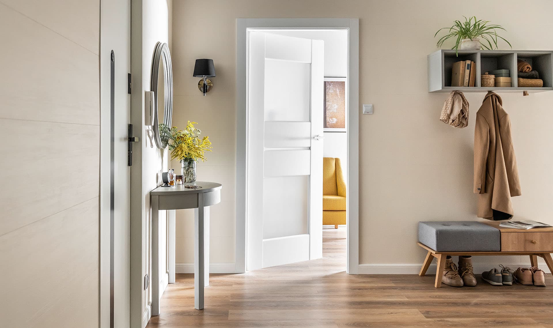 - Bezprzylgowa z krawędzią bez przylgi oraz 2 zawiasami chowanymi Estetic 80 (zawiasy stanowią wyposażenie dedykowanej ościeżnicy). W wersji bezprzylgowej zamek magnetyczny na klucz zwykły, blokadę łazienkową, wkładkę patentową lub zamek oszczędnościowy.