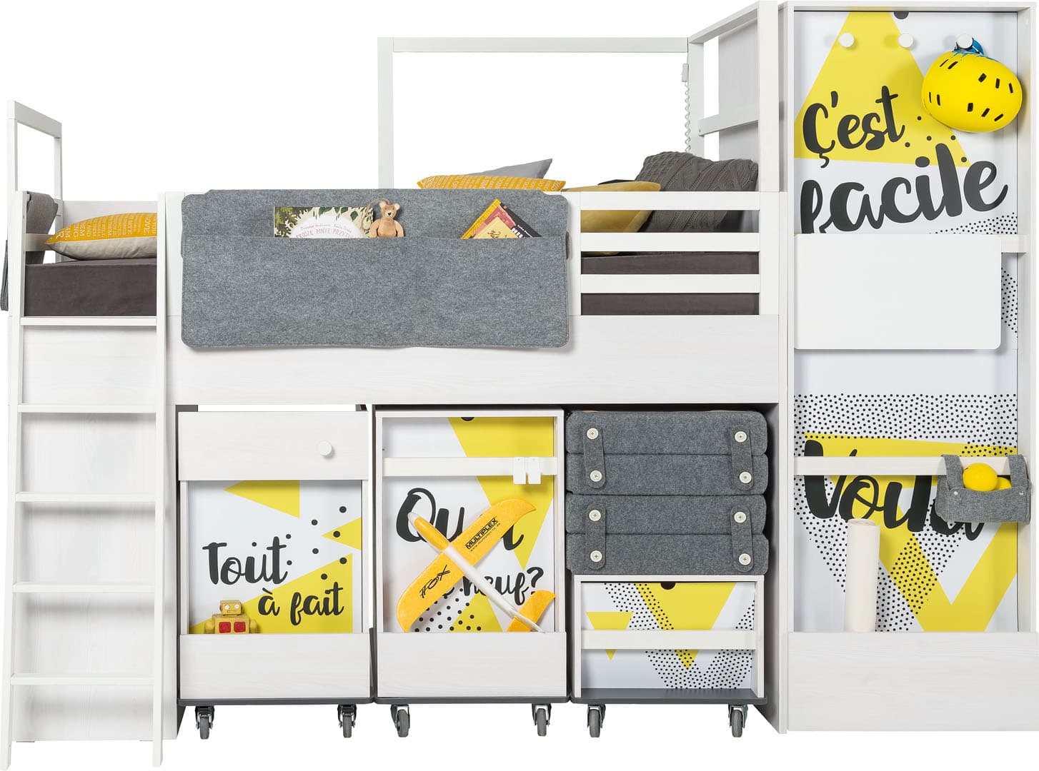There are several collections of overlays in the Nest by VOX collection, which can be placed in cargo closet and multi bed containers. There are 6 color versions available (overlays: pink, yellow, navy blue, light blue, green and red) and 4 collections with graphic prints (collection: Monsters, Voila, Art and Krata). This overlay is an element of the Voila collection and is designed for one of the multi bed pedestals, namely the pedestal with a container The overlay completely fills the front of the pedestal, creating a stylish arrangement. It is fixed with special locks attached to the pedestal itself. If the locks are lost, you can buy a spare set.The overlay can be removed at any time and replaced by another design. It does not leave any traces on the furniture. The Voila collection also includes overlays for other multi bed pedestals: desk and pedestal with bar and pedestal with shelves, and for the Cargo closet. Each of them has a modified design, so they create a harmonious yet diverse whole.