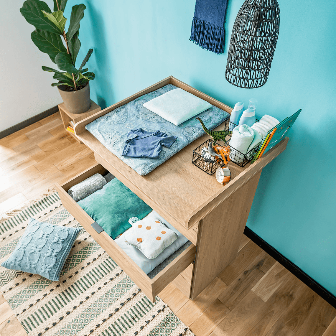 Na blacie komody z przewijakiem warto postawić miękki kosz na zabawki, w którym można umieścić różne grzechotki, aby zająć uwagę dziecka w czasie zmiany pieluchy. Przydadzą się też niewielkie koszyki, które pozwolą uporządkować i mieć pod ręką potrzebne akcesoria. Szczególnie przydatne są łagodne kosmetyki pielęgnacyjne, dzięki którym zadbamy o delikatną skórę maluszka również po kąpieli, a także ubranka.