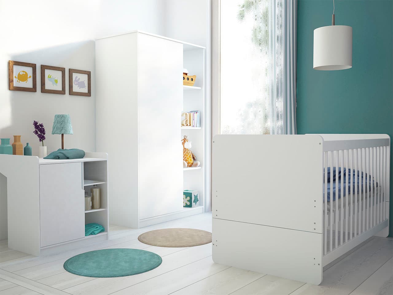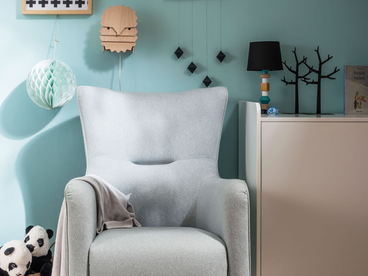 W szafie i komodzie znajdziecie też podręczne otwarte półki. Kroku Waszym potrzebom dotrzyma także łóżeczko – kiedy maluch zacznie chodzić, wyjmowane szczebelki umożliwią mu swobodne odkrywania świata. Z czasem przebudujecie mebel w tapczanik.