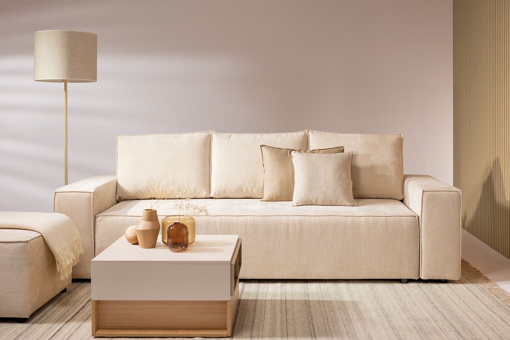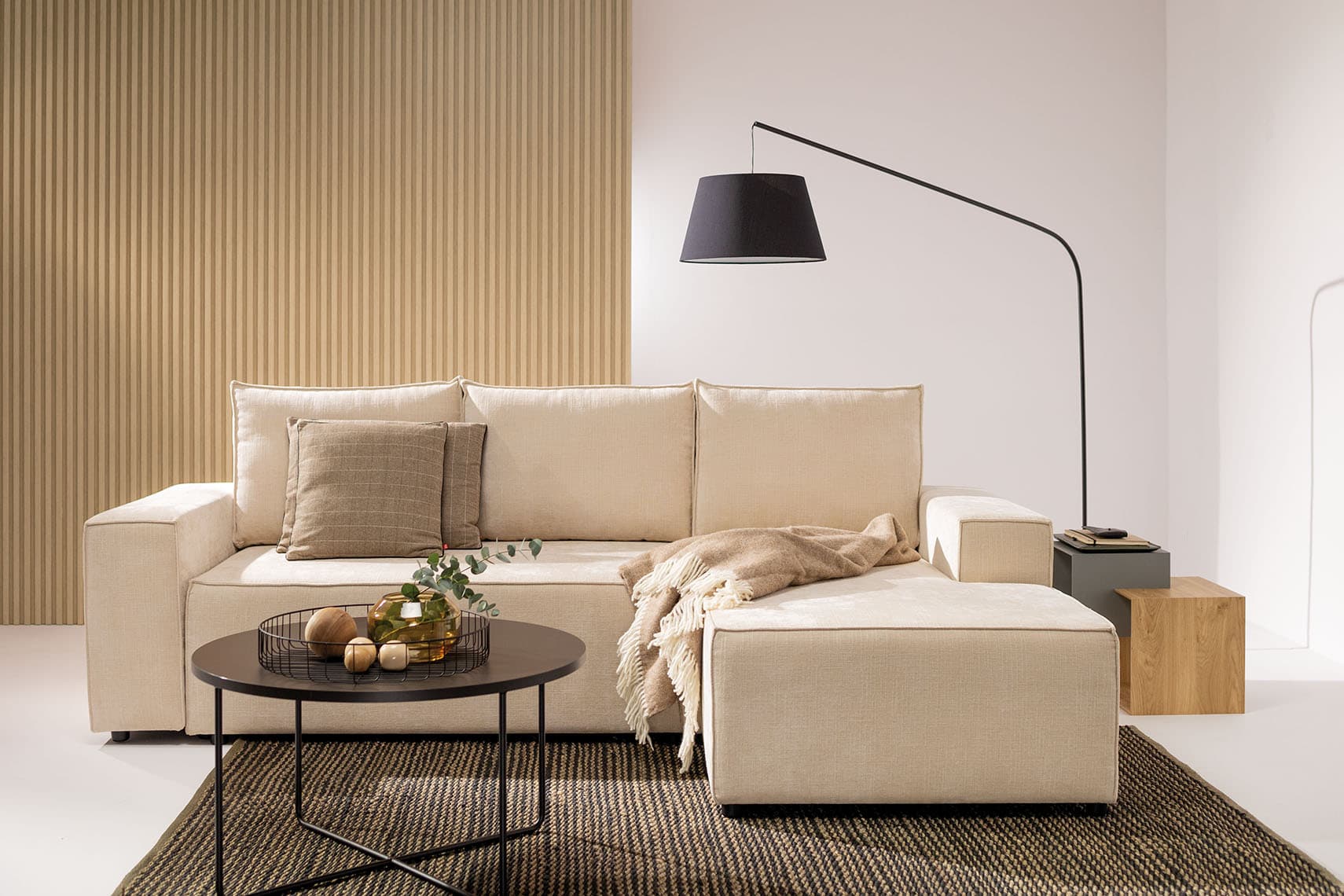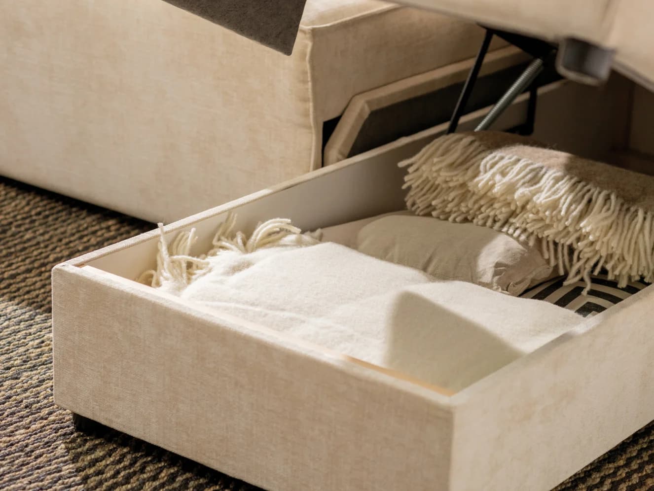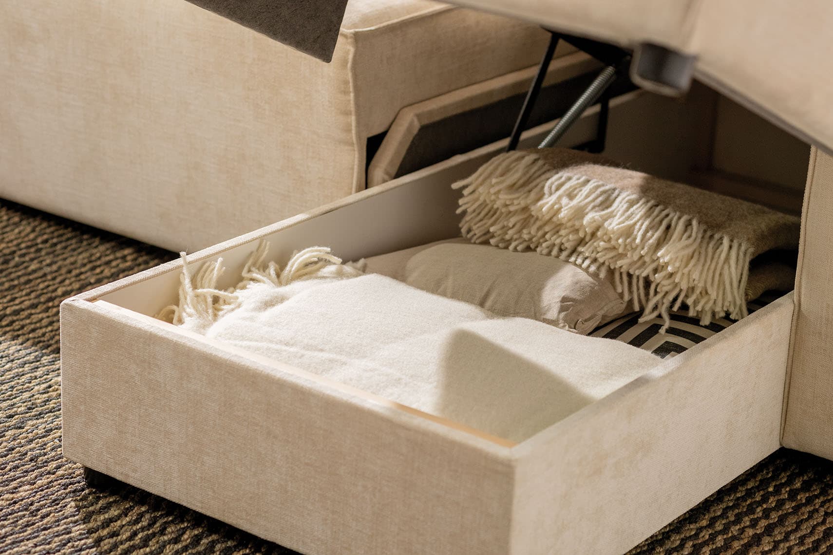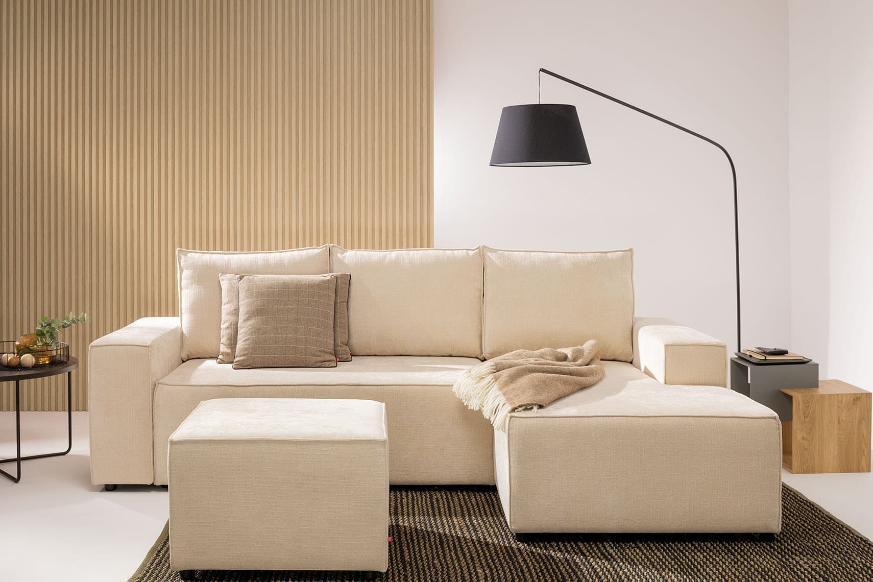 Wygodna sofa, przestronny narożnik oraz mobilny puf. Kompaktowe i uniwersalne warianty Nilli odnajdą się we wnętrzach o różnej wielkości. Dostawiając puf do sofy czy narożnika zyskasz jeszcze więcej miejsca na wypoczynek. W szezlongu narożnika znajdziesz pojemnik na pościel.