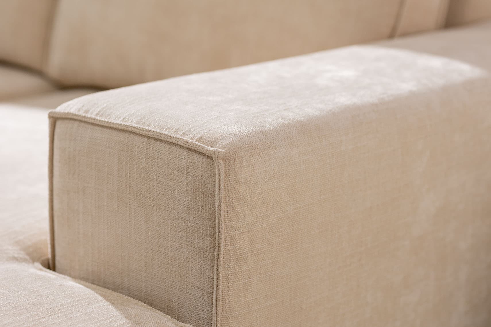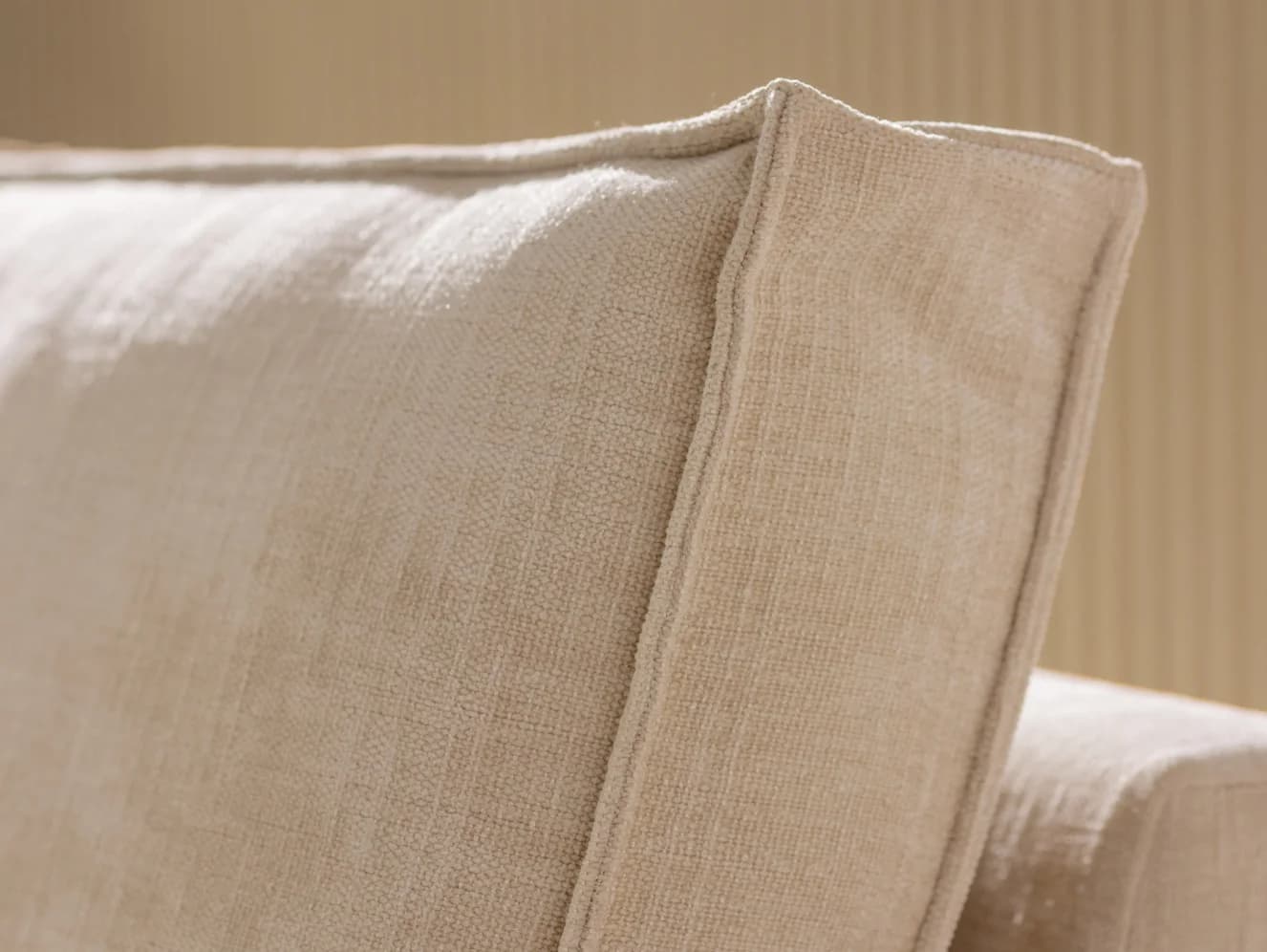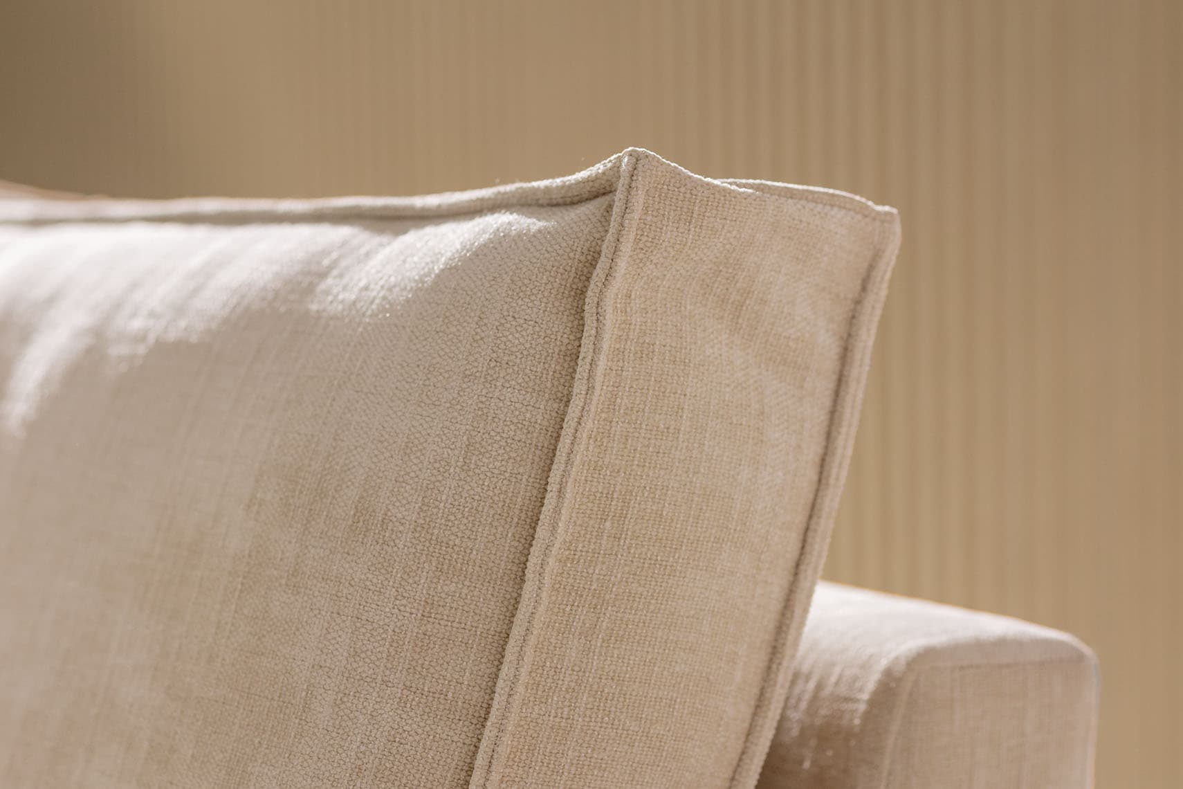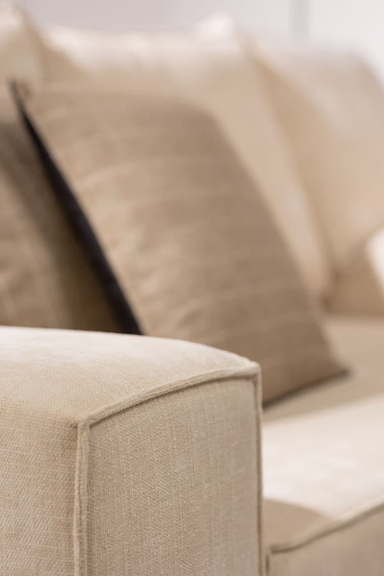 Charakterystyczne przeszycia podkreślają formę mebla. Tył mebla został wykończony z najwyższą dbałością, można go więc odstawić od ściany i prezentować w pełnej krasie. Lukę, która powstaje podczas rozkładania sofy między siedziskiem a oparciem wypełniliśmy dyskretną zaszewką.