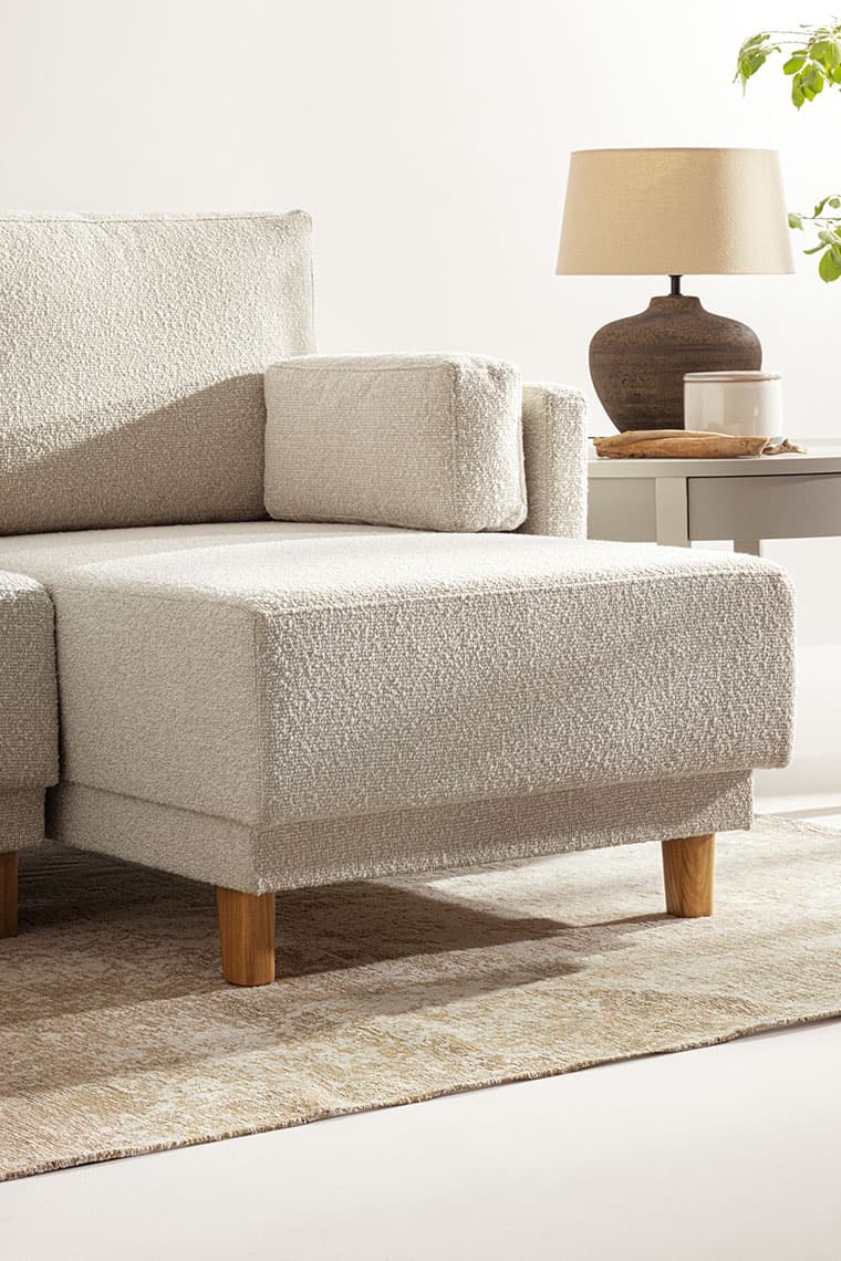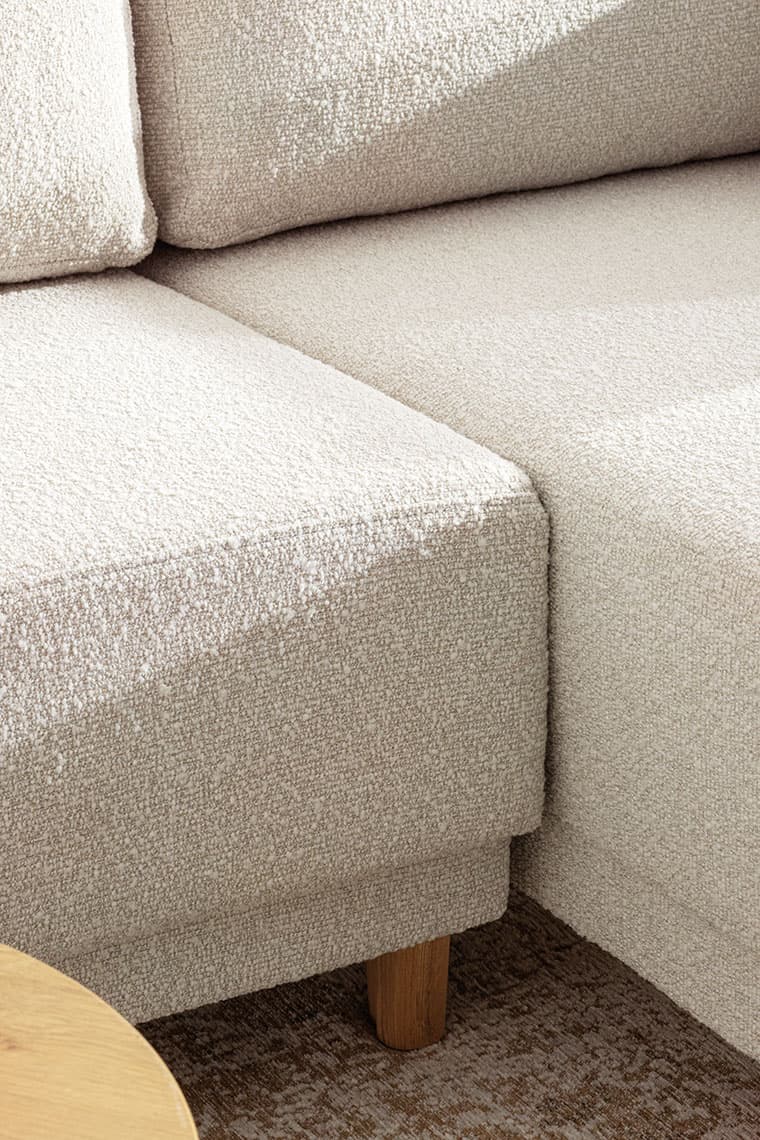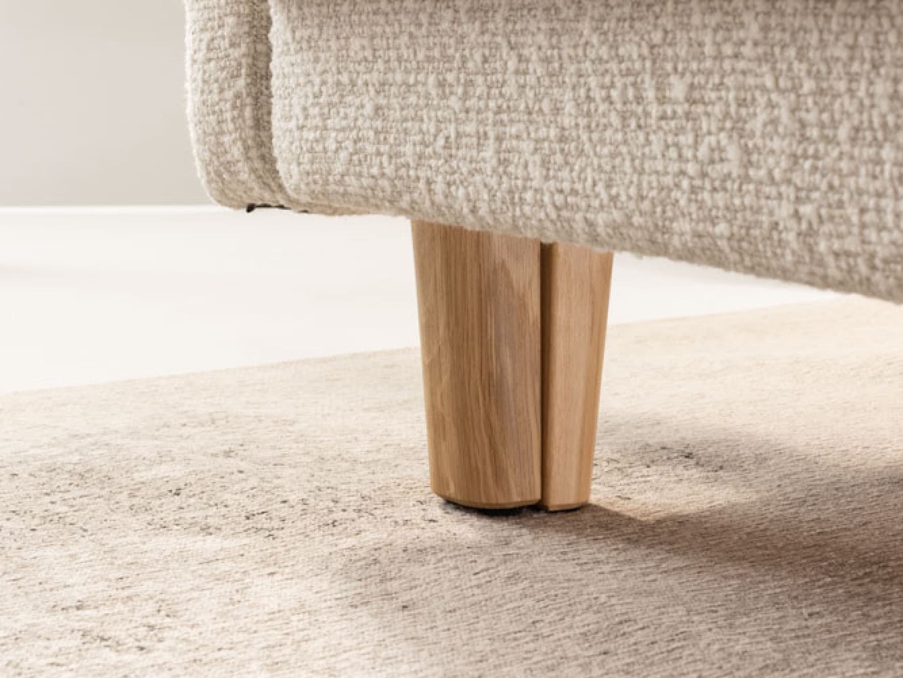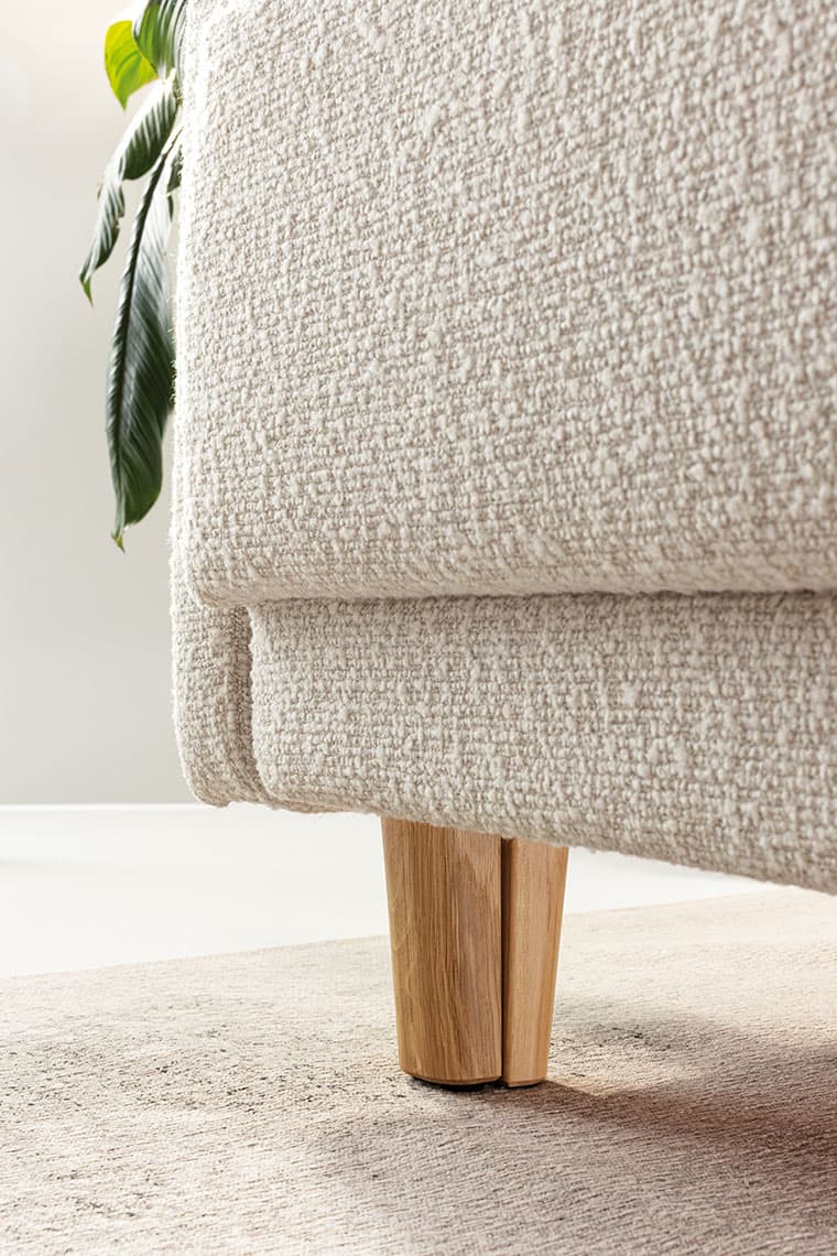 Przednie nóżki sofy, dla wygody rozkładania do funkcji spania, są złożone z dwóch części. Aby mebel po złożeniu wyglądał estetycznie, nóżki tworzą spójną wizualnie całość. Dostępne są w wersji czarnej i dębowej.