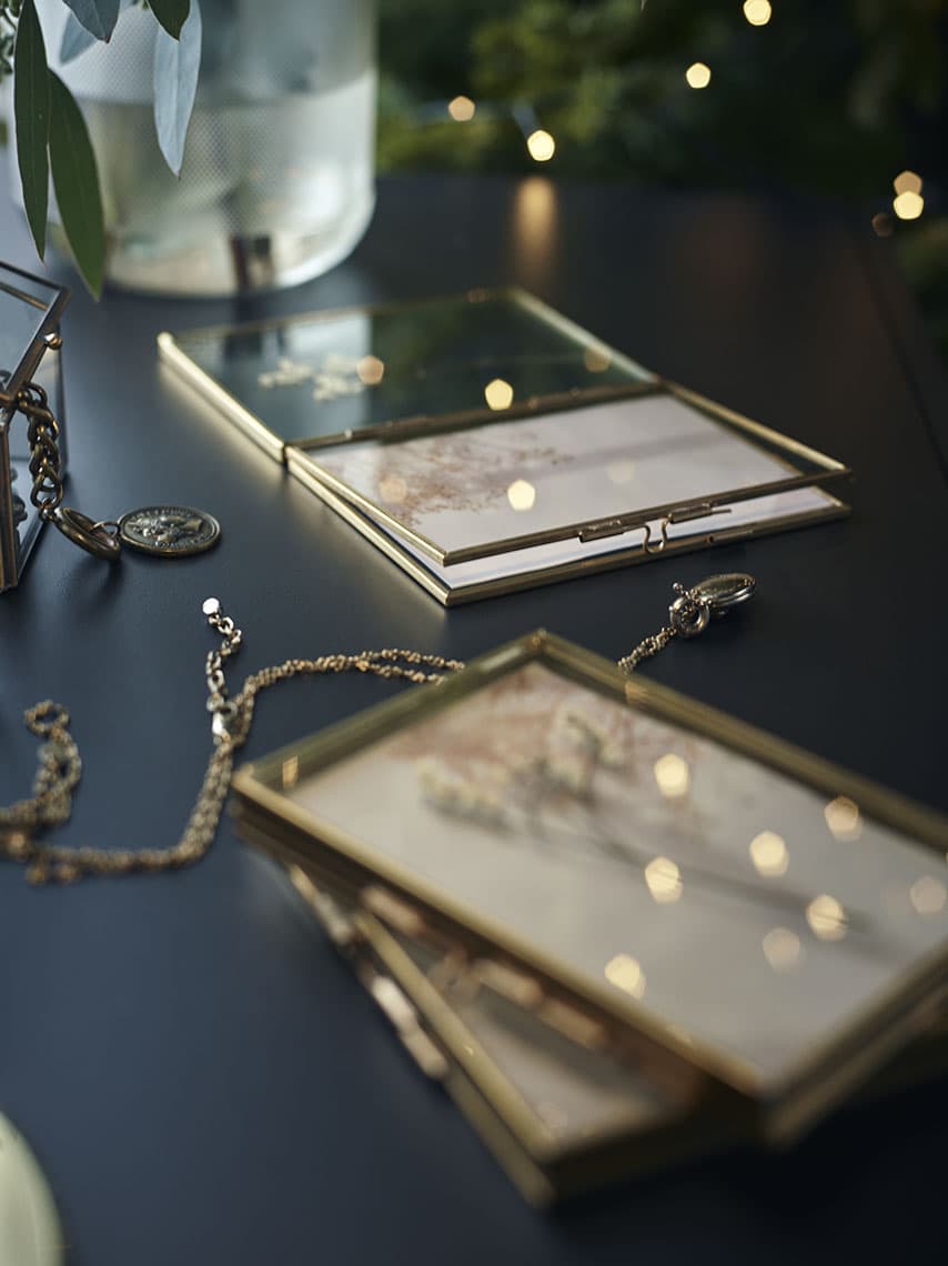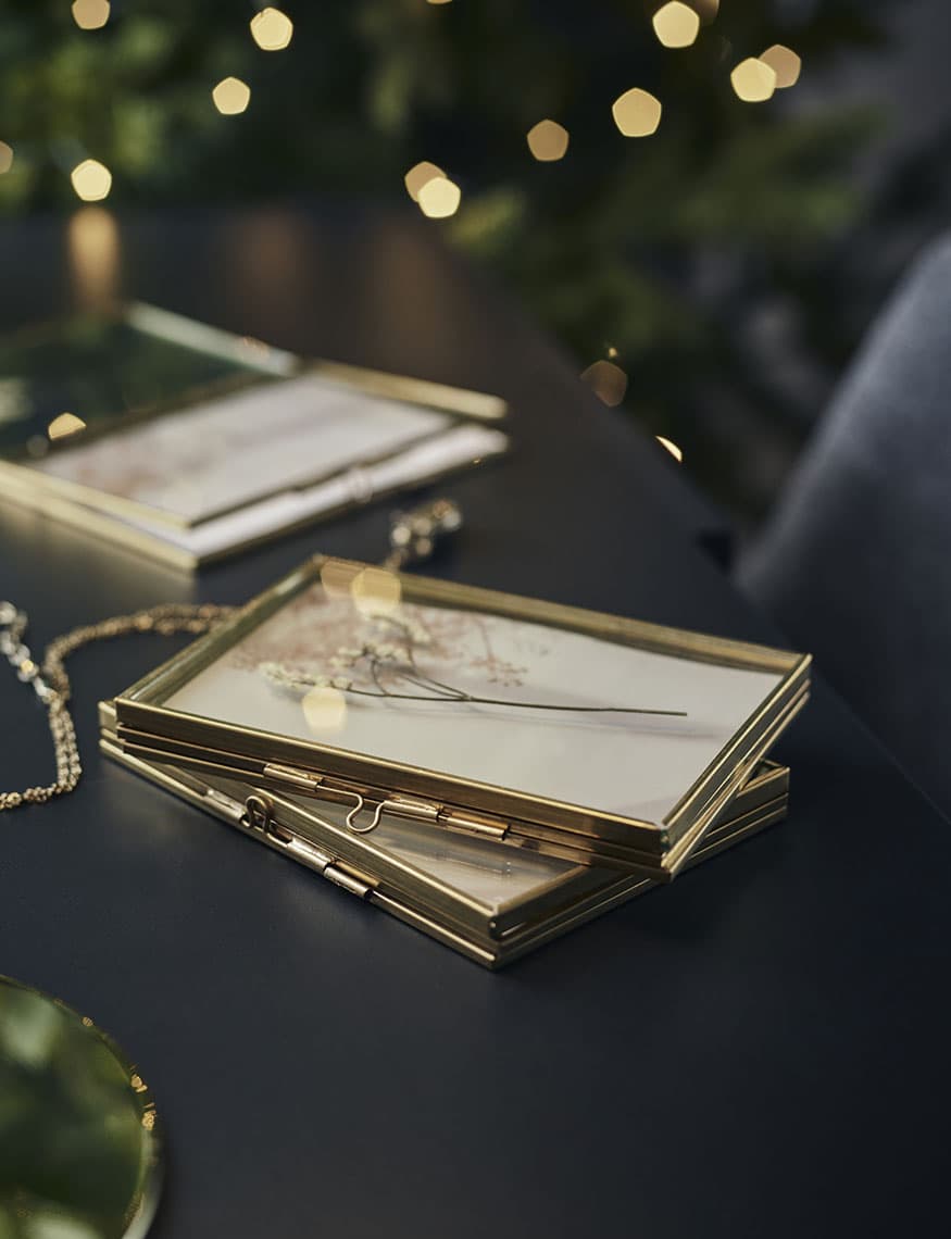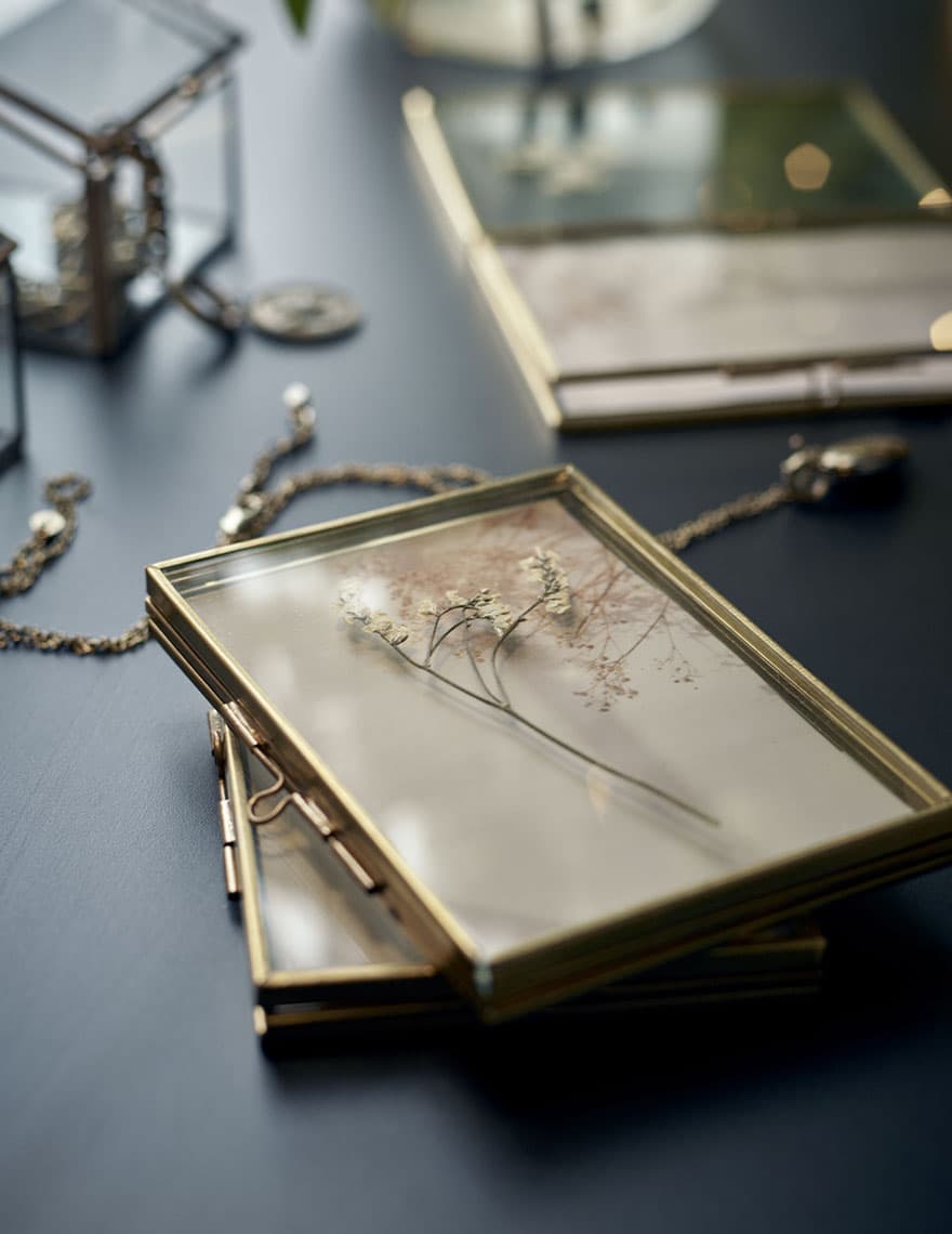 W jednej części znajduje się dekoracja z suszonej rośliny, a druga posiada miejsce na zdjęcie.