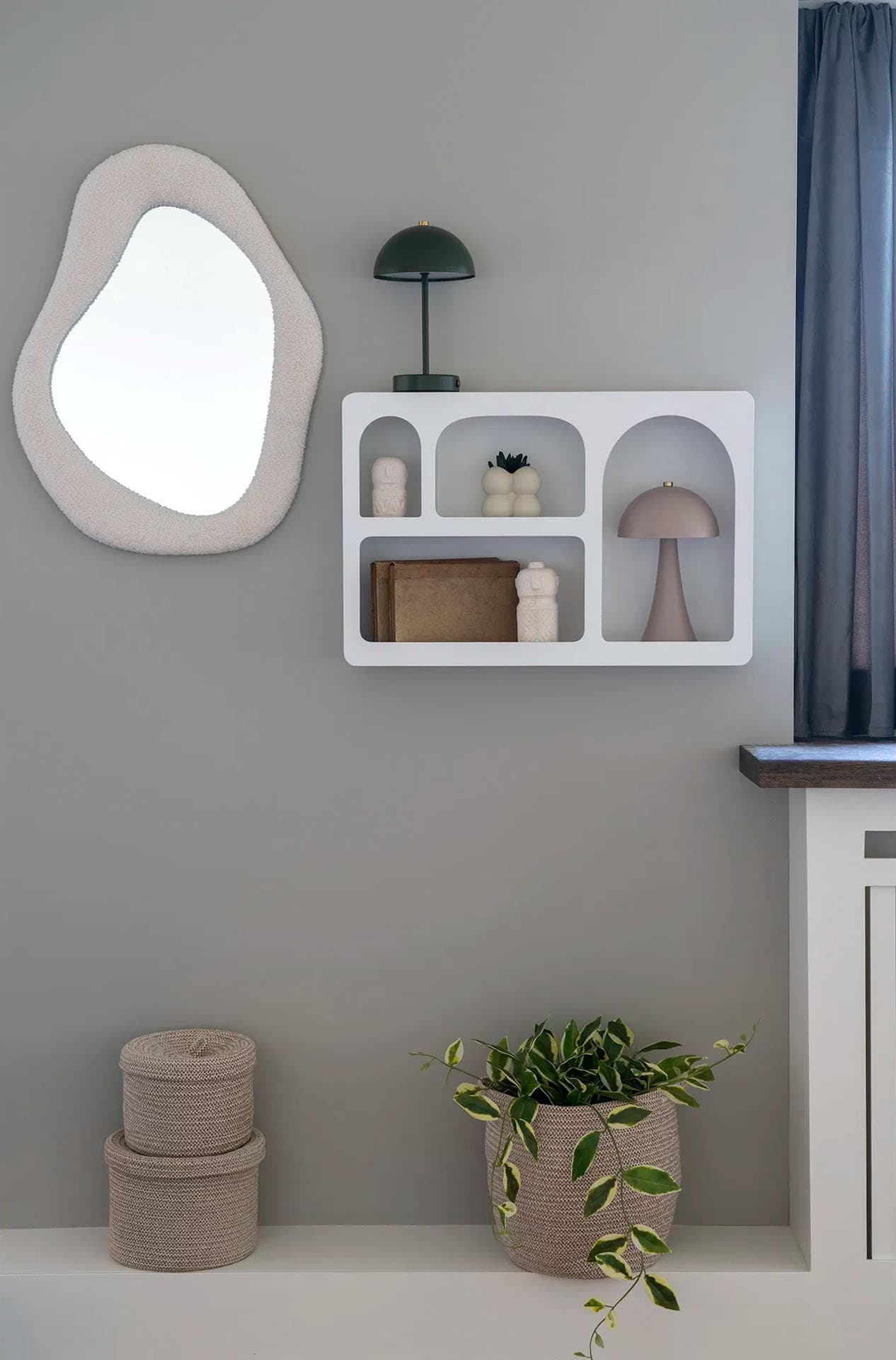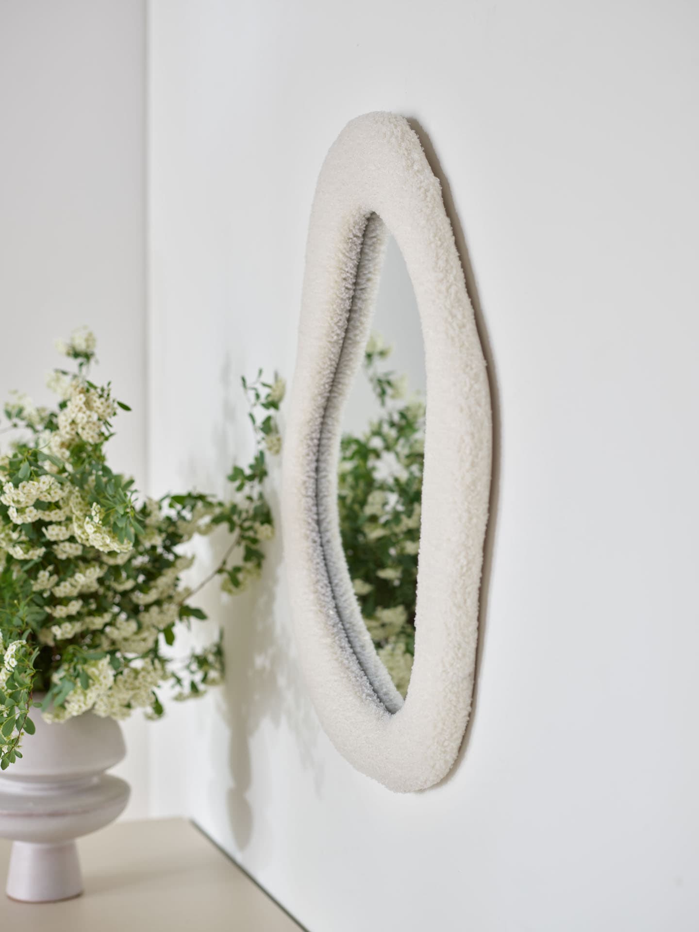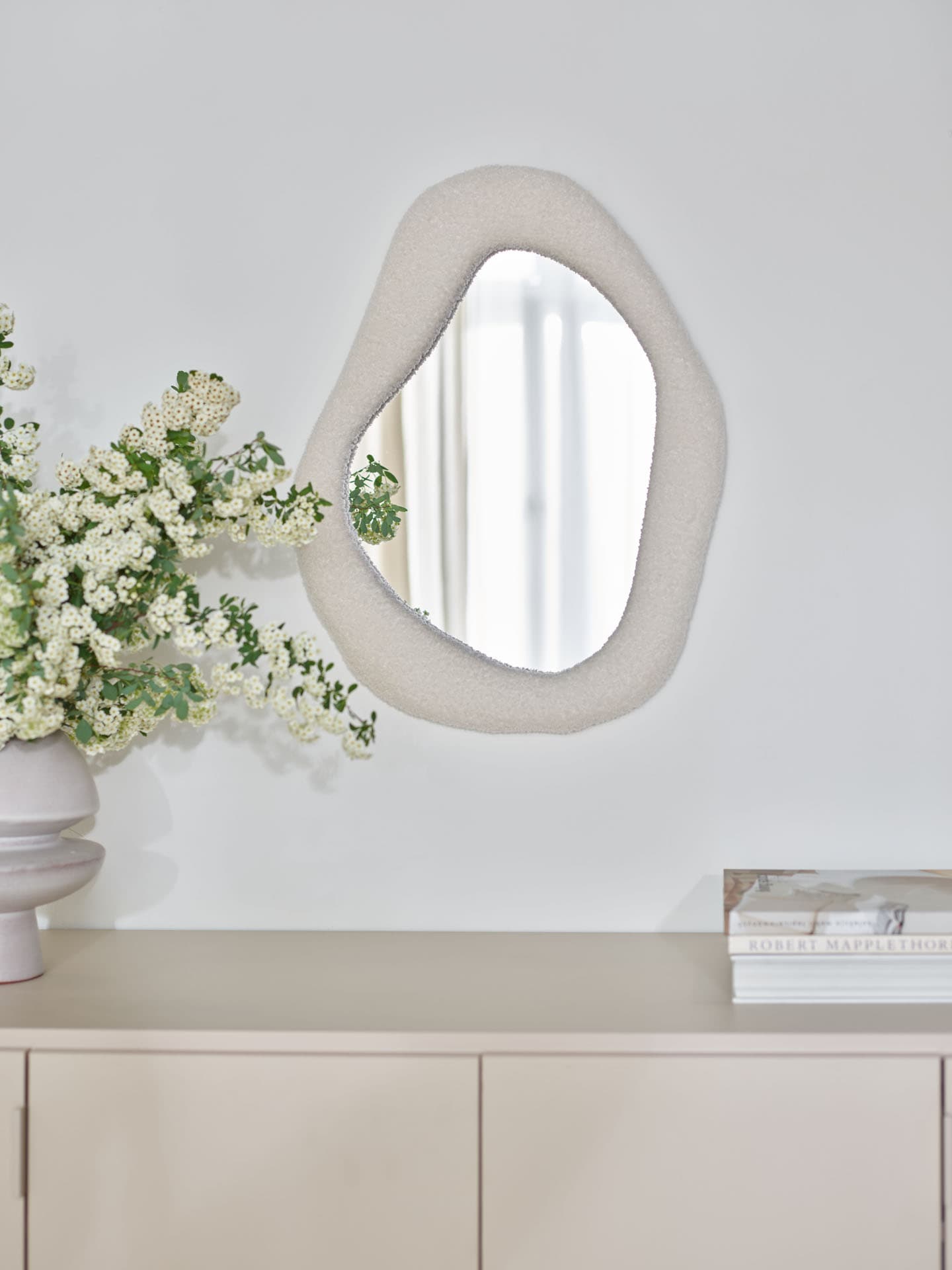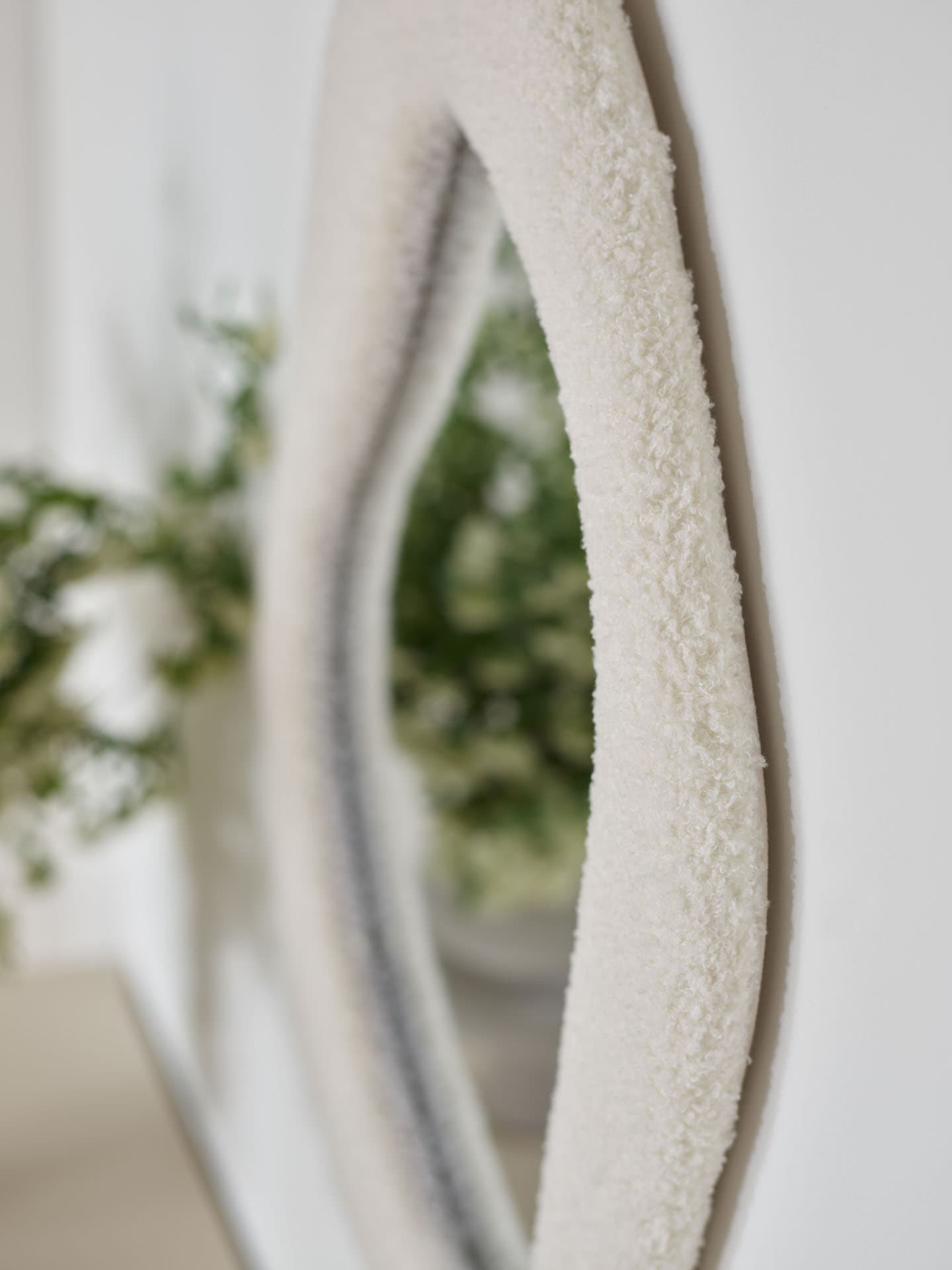 Lustro Bosa to ciekawy akcent dekoracyjny o nieregularnym, organicznym kształcie. Otoczone ramą z tkaniny bouclé w białej tonacji, wprowadza do wnętrza miękkość i przytulność, idealnie wpisując się w nowoczesne aranżacje.