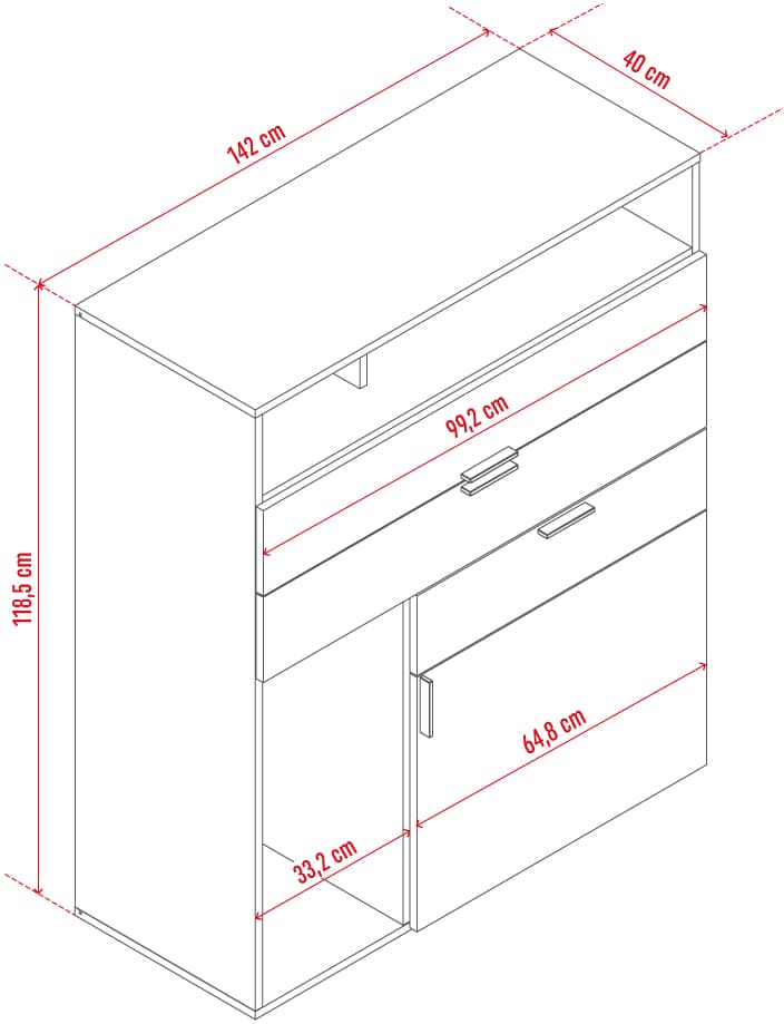 - Bufet będzie pasował także do sypialni, domowego biura lub pokoju nastolatka. W szufladzie i zamykanej szafce przechowasz osobiste drobiazgi, a na otwartych półkach ustawisz książki lub dekoracje.