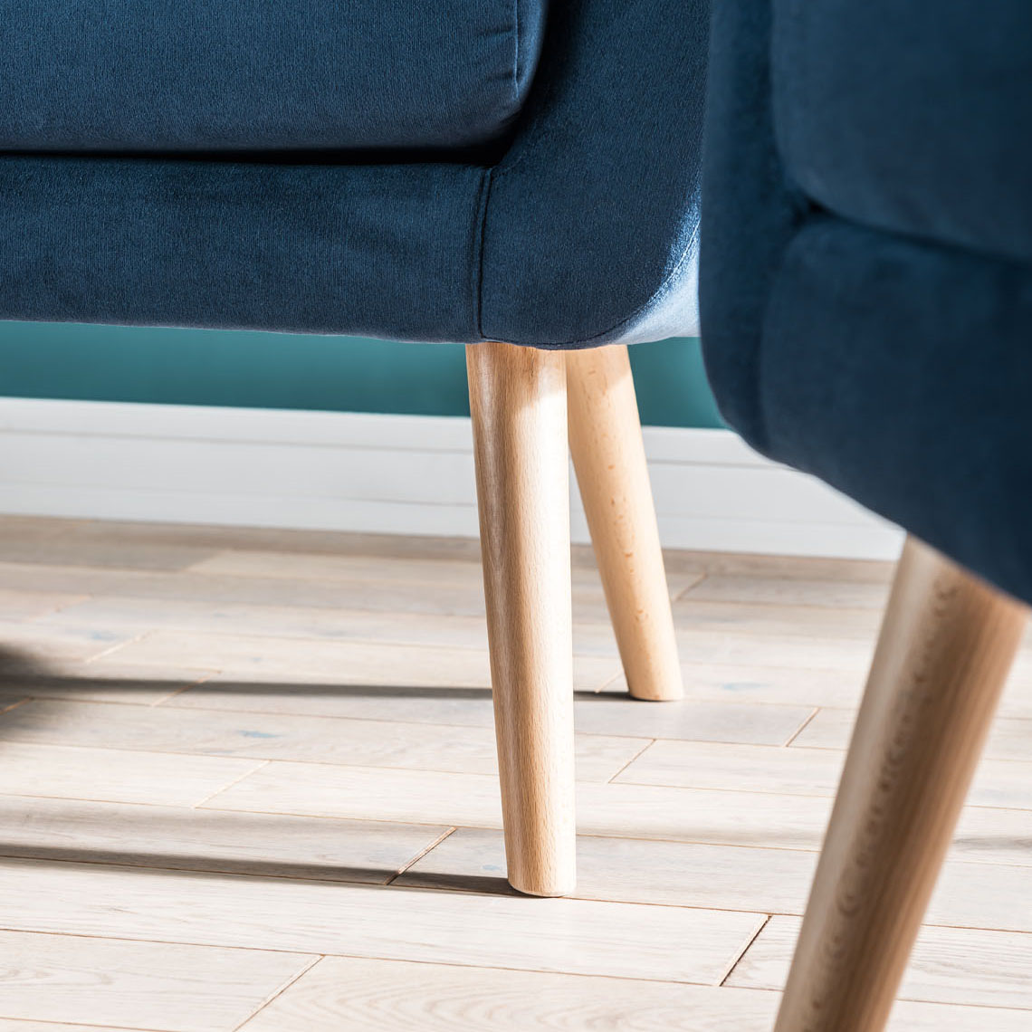 Siedzisko wypełnione wysokoelastyczną pianką. Miękka pianka tapicerska w oparciu mebla. Drewniane nóżki z litego buku.