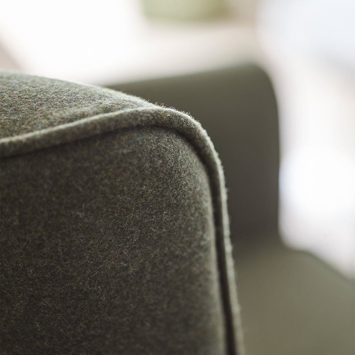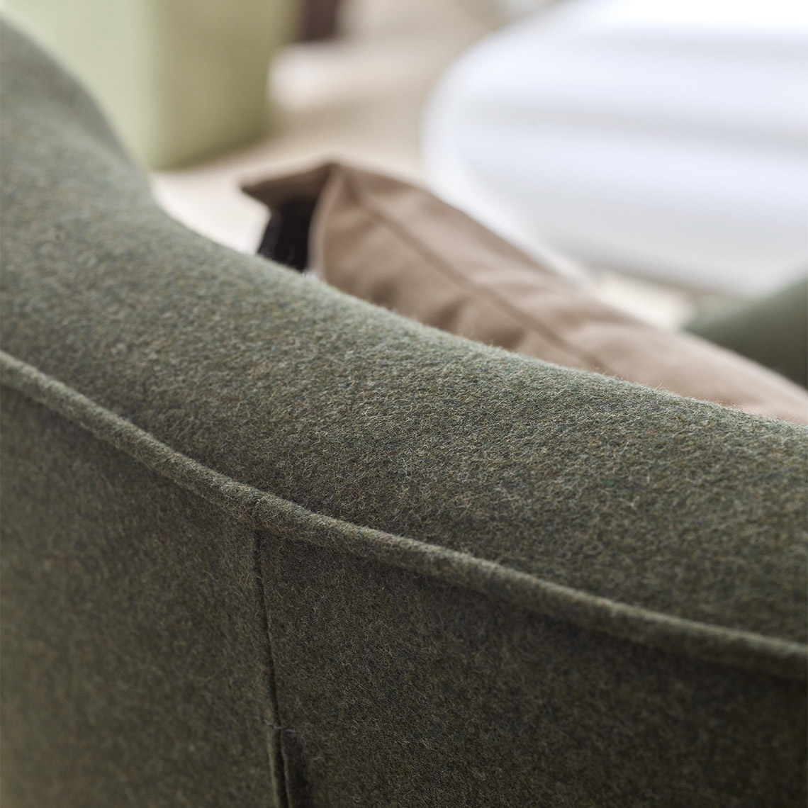 Tapicerowany fotel Zouk ma szerokie oparcie, wygodnie wyprofilowane podłokietniki i wysokie, drewniane nóżki. Mebel jest produkowany na zamówienie – kupujący określa tkaninę obiciową i kolor nóżek.