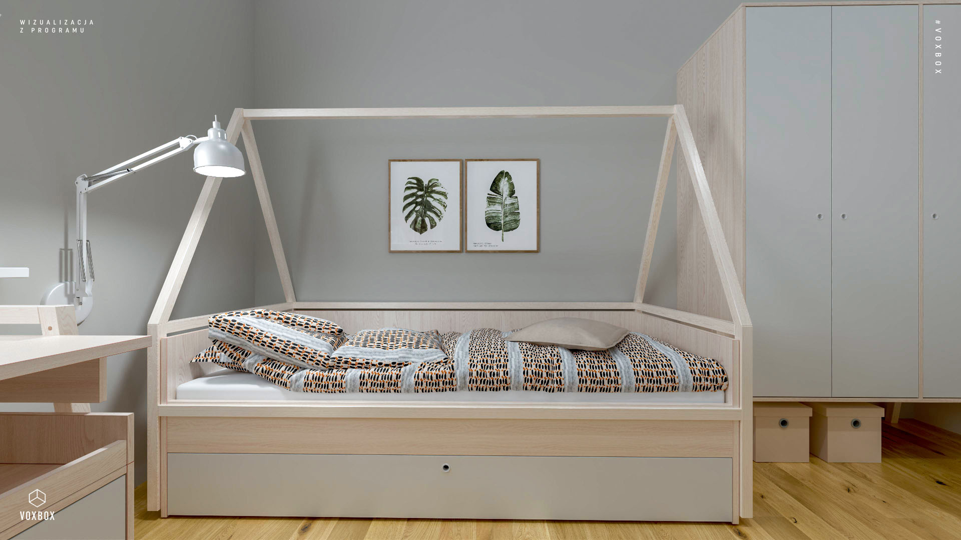 Kanapa z uchylnym stelażem, po podniesieniu którego uzyskujemy dostęp do pojemnika na pościel. Kanapę można uzupełnić o szufladę z frontem białym lub grafitowym, albo łóżko dolne ukryte za białą maskownicą. Dodatkowo, do kanapy, można dokupić wózek Tipi, który doskonale sprawdza się w pokoju dziecięcym i młodzieżowym jako "baza" do wszelakich zabaw lub miejsce zawieszania ozdób tworzących charakter pokoju. Kanapa dostępna także w wersji z szufladą lub z zapasowym łóżkiem dolnym i maskownicą.