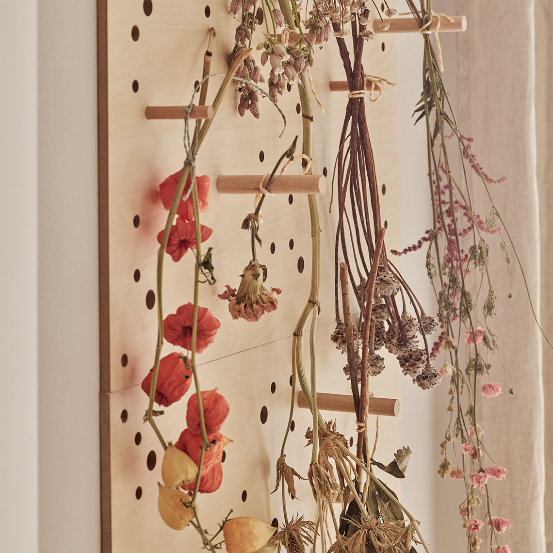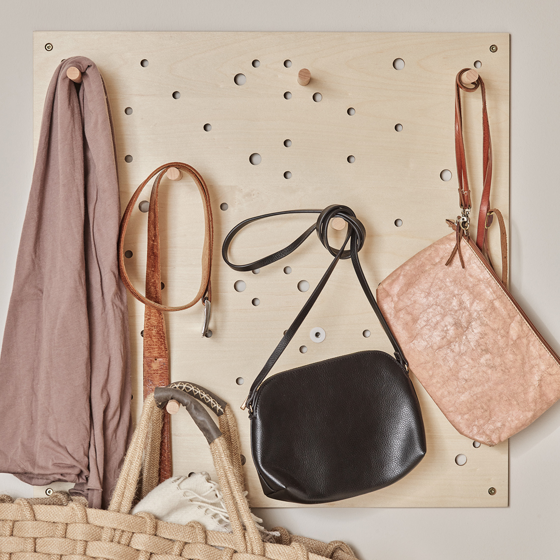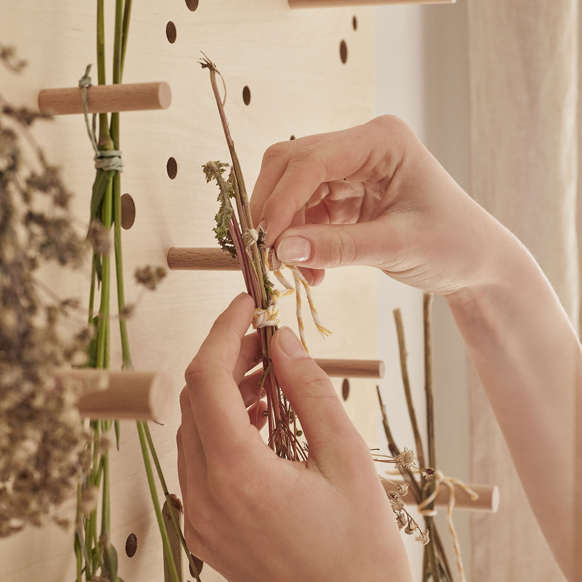 Zestaw 10 drewnianych kołków, dopasowanych do tablicy Slot. Pozwalają na przymocowanie dedykowanych akcesoriów do panelu. Mogą pełnić także funkcję wieszaków.