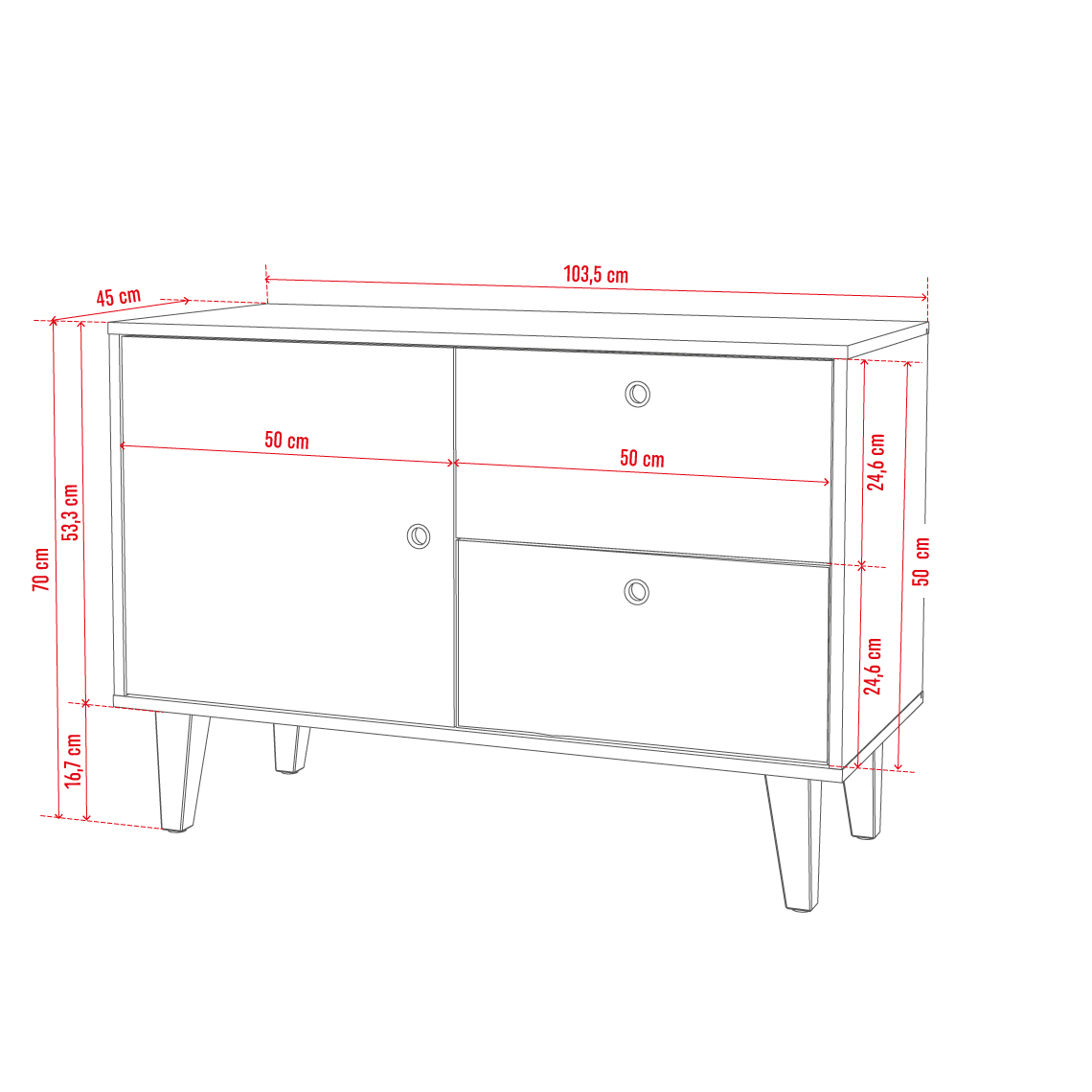 - Stabilność komody gwarantują 18-centymetrowe nóżki, wykonane z litego drewna. Ich rzeczywisty rozstaw może się nieco różnić od zaprezentowanego na zdjęciach. Uniesienie mebla to znaczne ułatwienie odkurzania w pokoju.