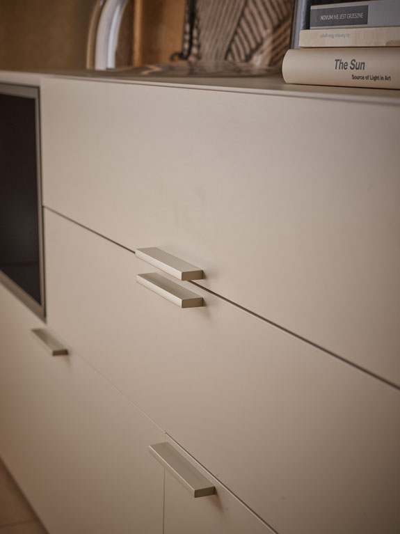 - Wygodny dostęp do zawartości mebla zapewniają minimalistyczne uchwyty. Można wybrać jedną z dwóch wersji: metalową malowaną na kolor komody lub dębową.