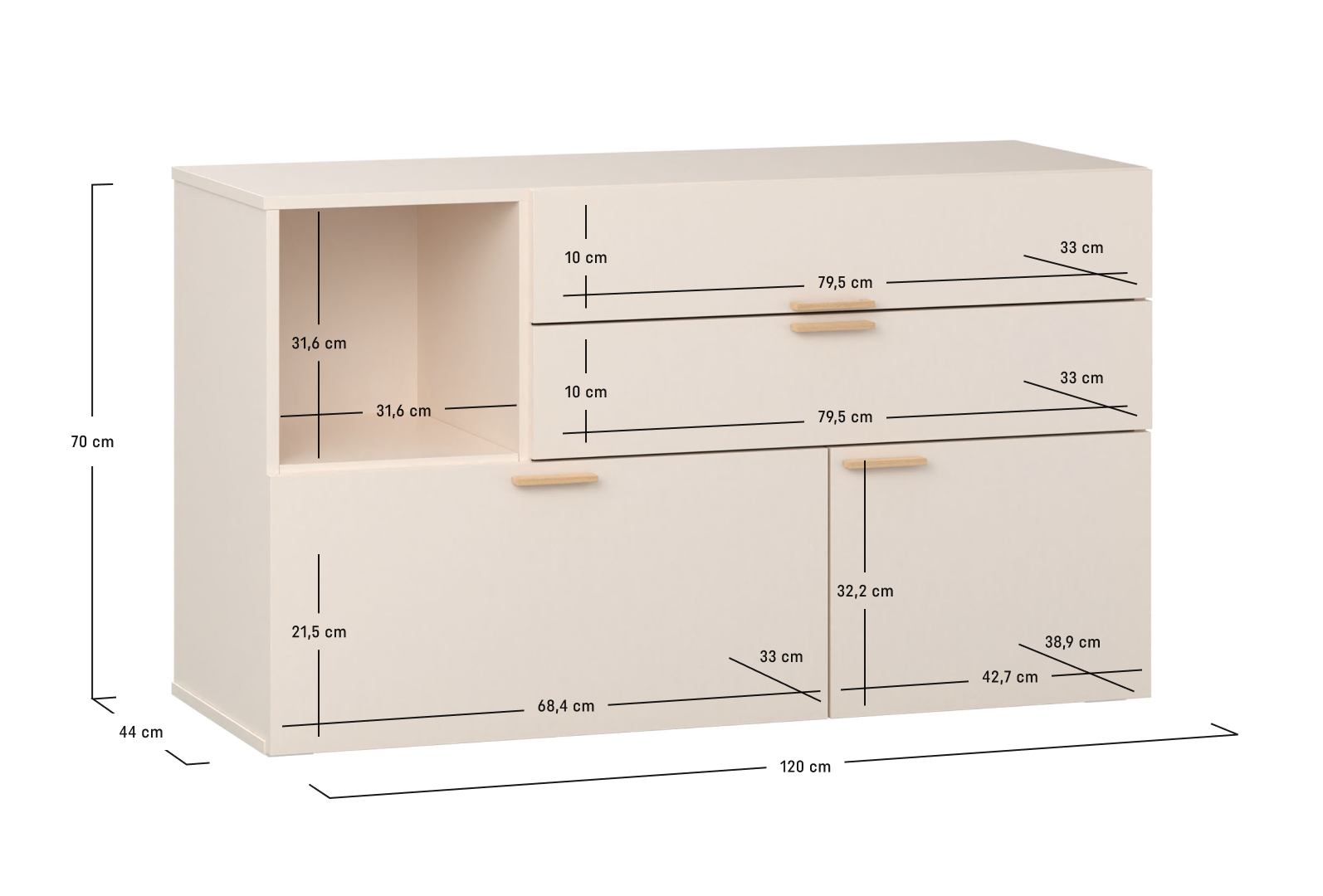 - Zamykana szafka, otwarta przestrzeń i aż trzy szuflady w jednym meblu. Ta kompaktowa komoda ma niespodziewanie dużą pojemność!