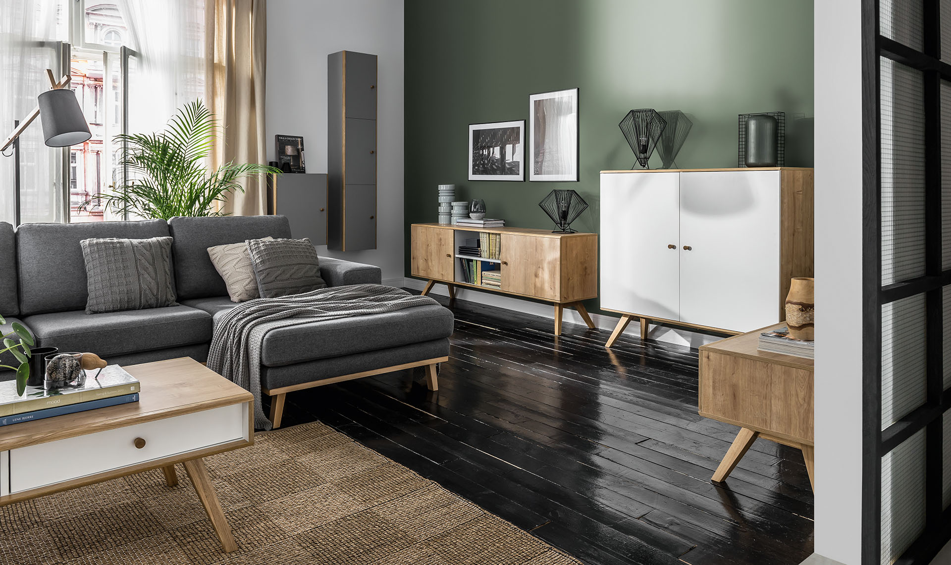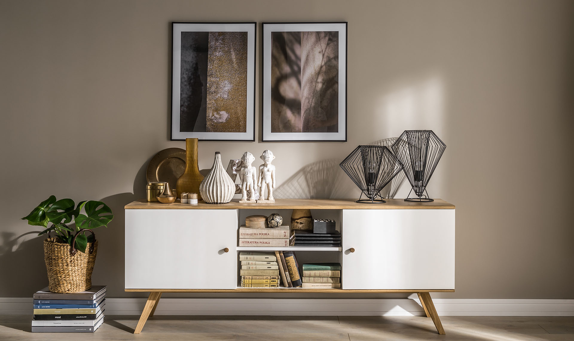 - Dębowy korpus komody współgra z czystą bielą wnętrz, tworząc nienachalny, uniwersalny kontrast.