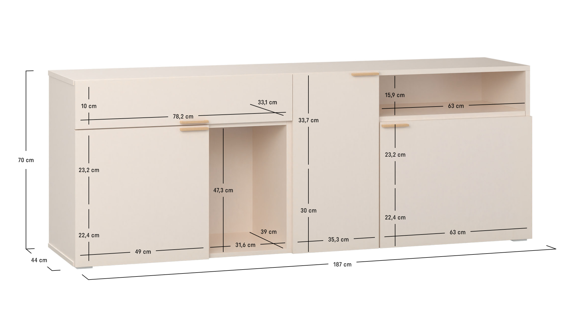 - Korpus, półki i drzwi komody mają odcień piaskowego beżu.