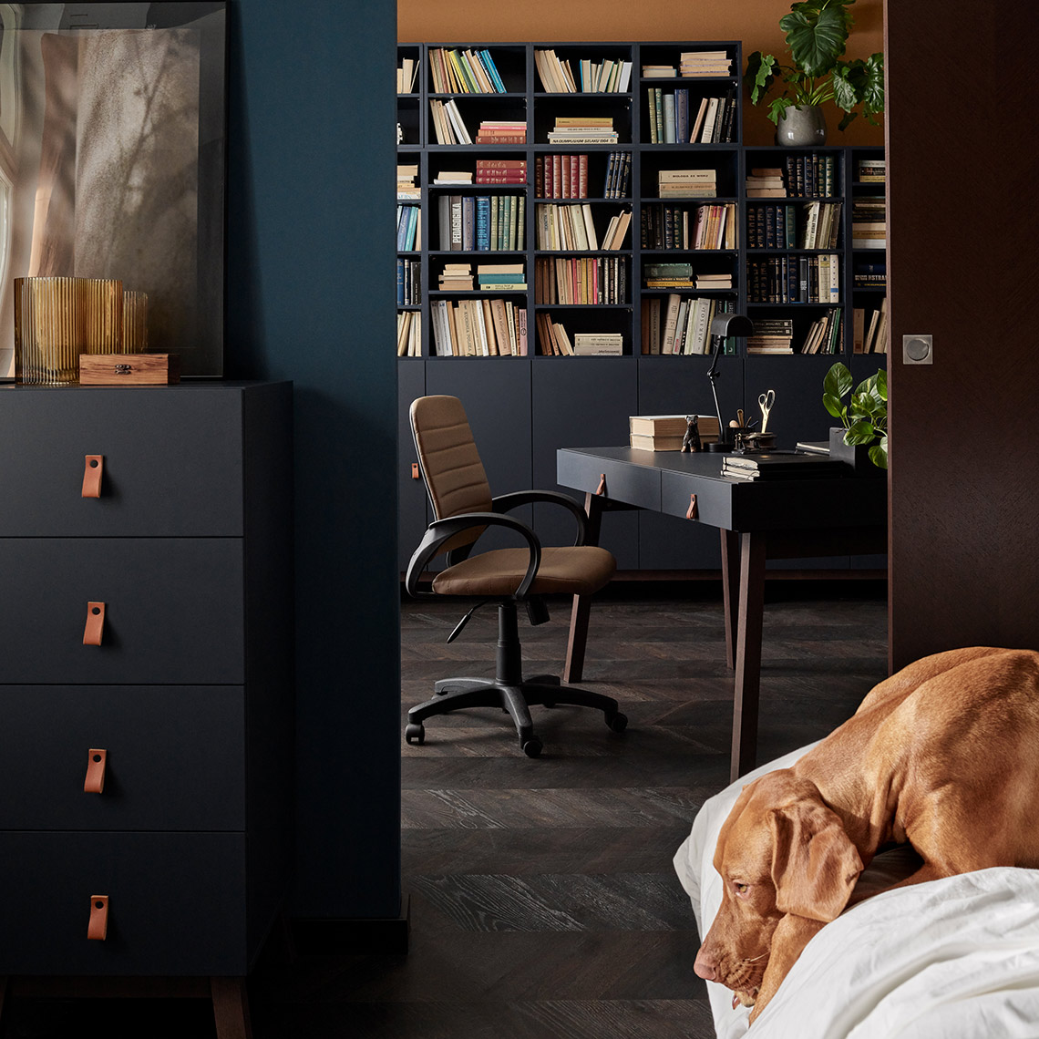- Otwarta przestrzeń na książki czy może praktyczna szafka na ubrania? Zadecyduj także o umiejscowieniu drzwi, przeszklonych frontów lub całkowicie z nich zrezygnuj, pozostawiając dużo otwartej przestrzeni.