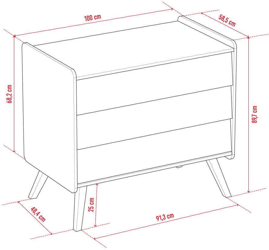 - Bezpieczeństwo korzystania z mebla zwiększają zaokrąglone narożniki. Wysokie ukośne nóżki nadają komodzie wizualnej lekkości i ułatwiają sprzątanie w pokoju.