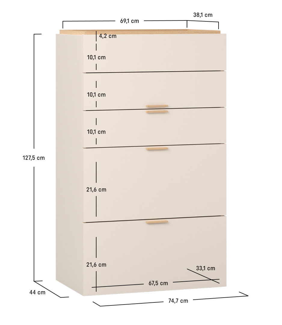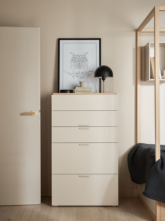 - Komoda ma trzy mniejsze i dwie większe szuflady z systemem cichego domyku. Ich asymetryczny układ ułatwia sortowanie rzeczy. Wysokość płytkich szuflad wynosi 17,6 cm, a głębokich – 34,8 cm.