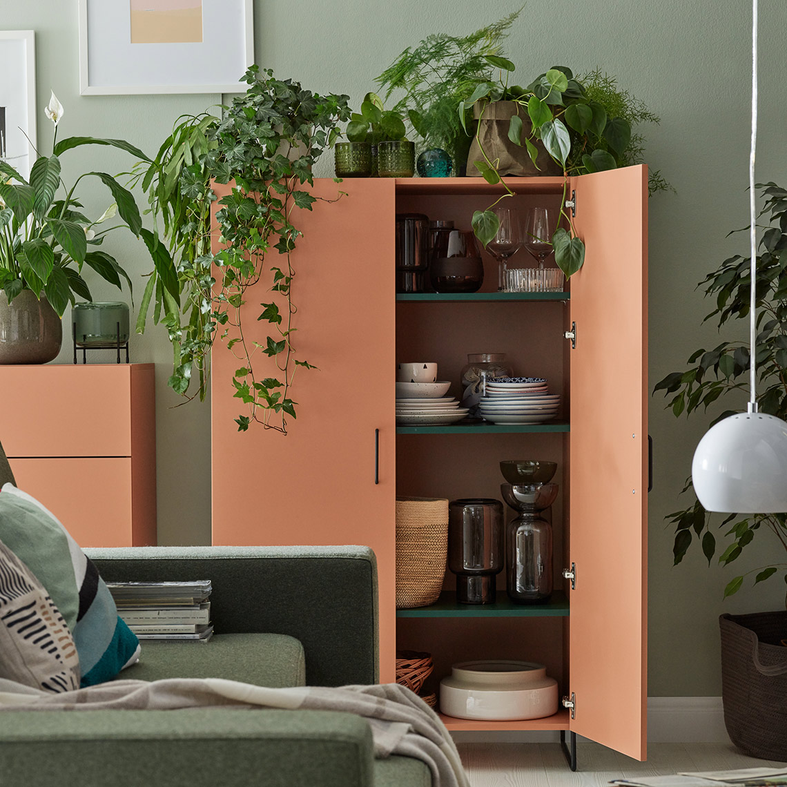 - Dla frontów, korpusu i części wewnątrz kredensu możesz wybrać jedną z 11 barw (biała, szara, czarna, nude, indygo, szafran, zielona oraz dekor dębowy w czterech odcieniach).
