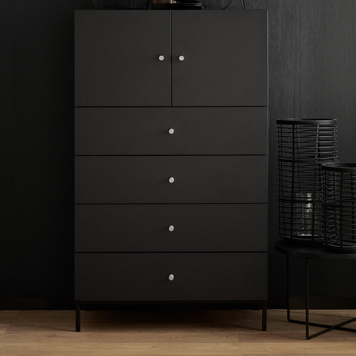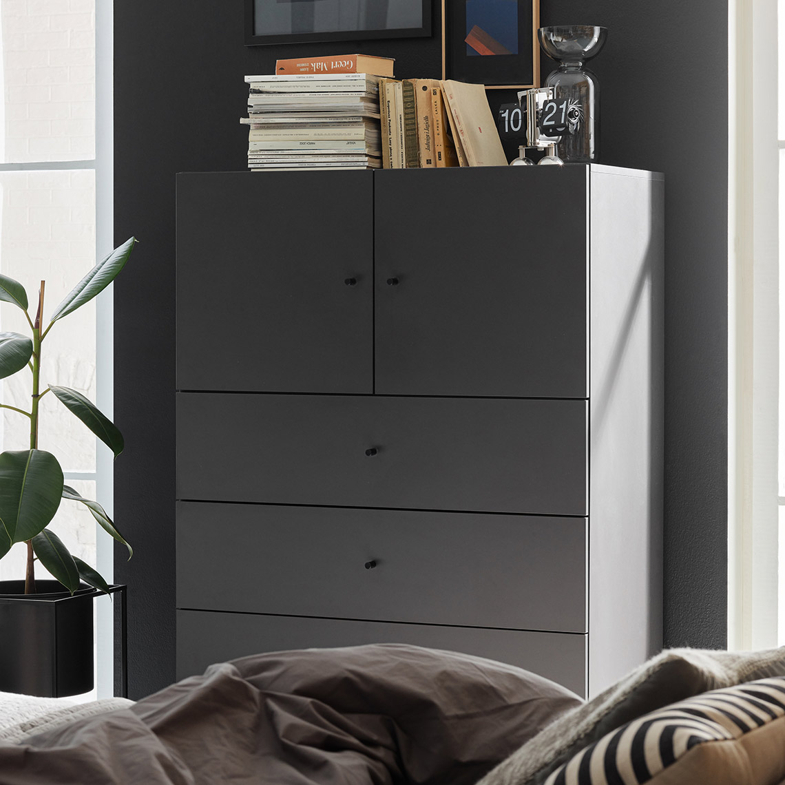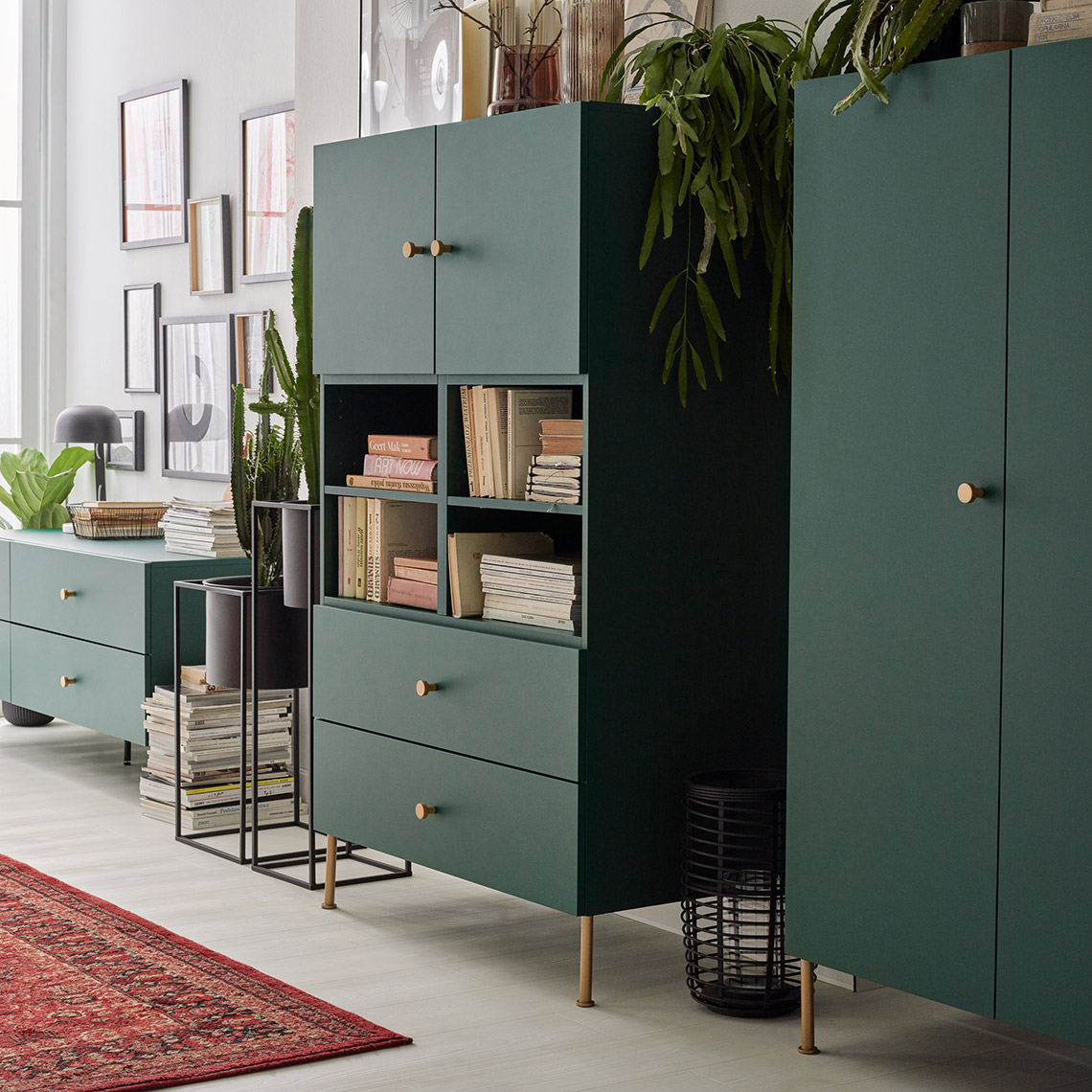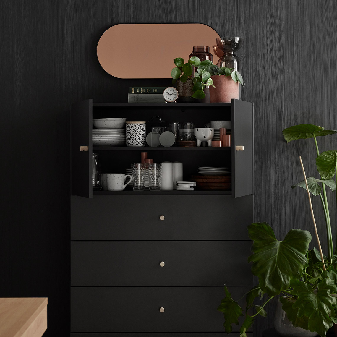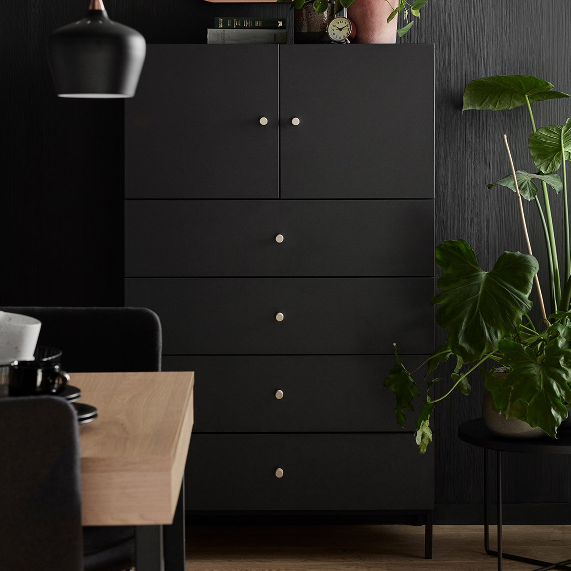 - By jak najlepiej dopasować kredens do Twoich potrzeb, skorzystaj z różnych rozmiarów półek i szuflad. Możesz rozmieścić je w wybranych przez Ciebie miejscach.