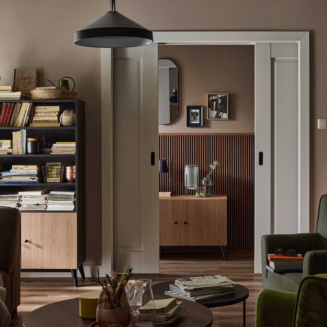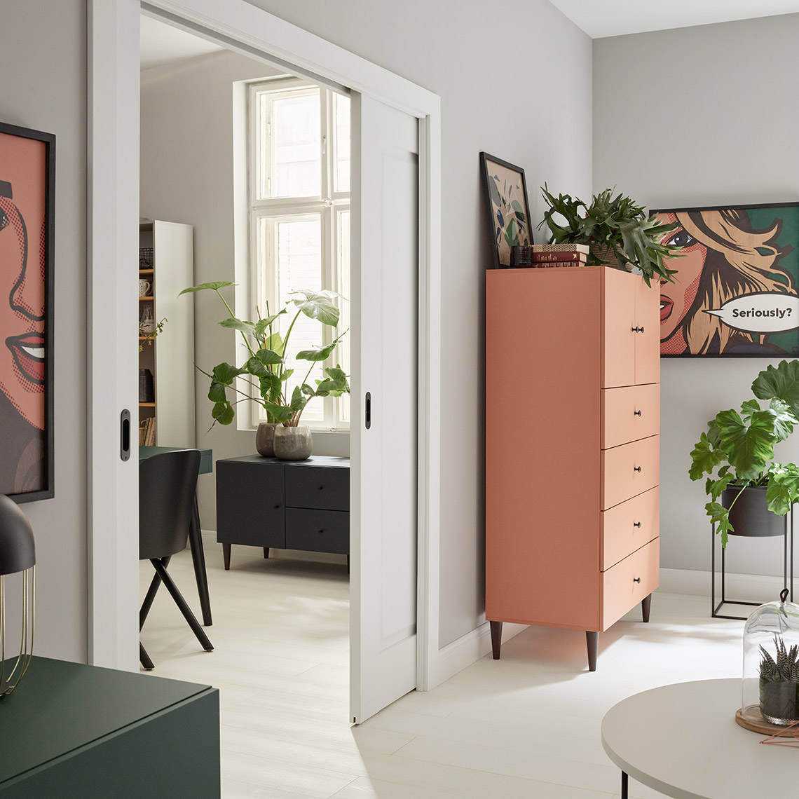 - Kredens uzupełnij o jeden z 11 rodzajów uchwytów (drewnianych, metalowych lub ze skóry). Gładkie fronty zyskasz wykorzystując dotykowy system Push to open.