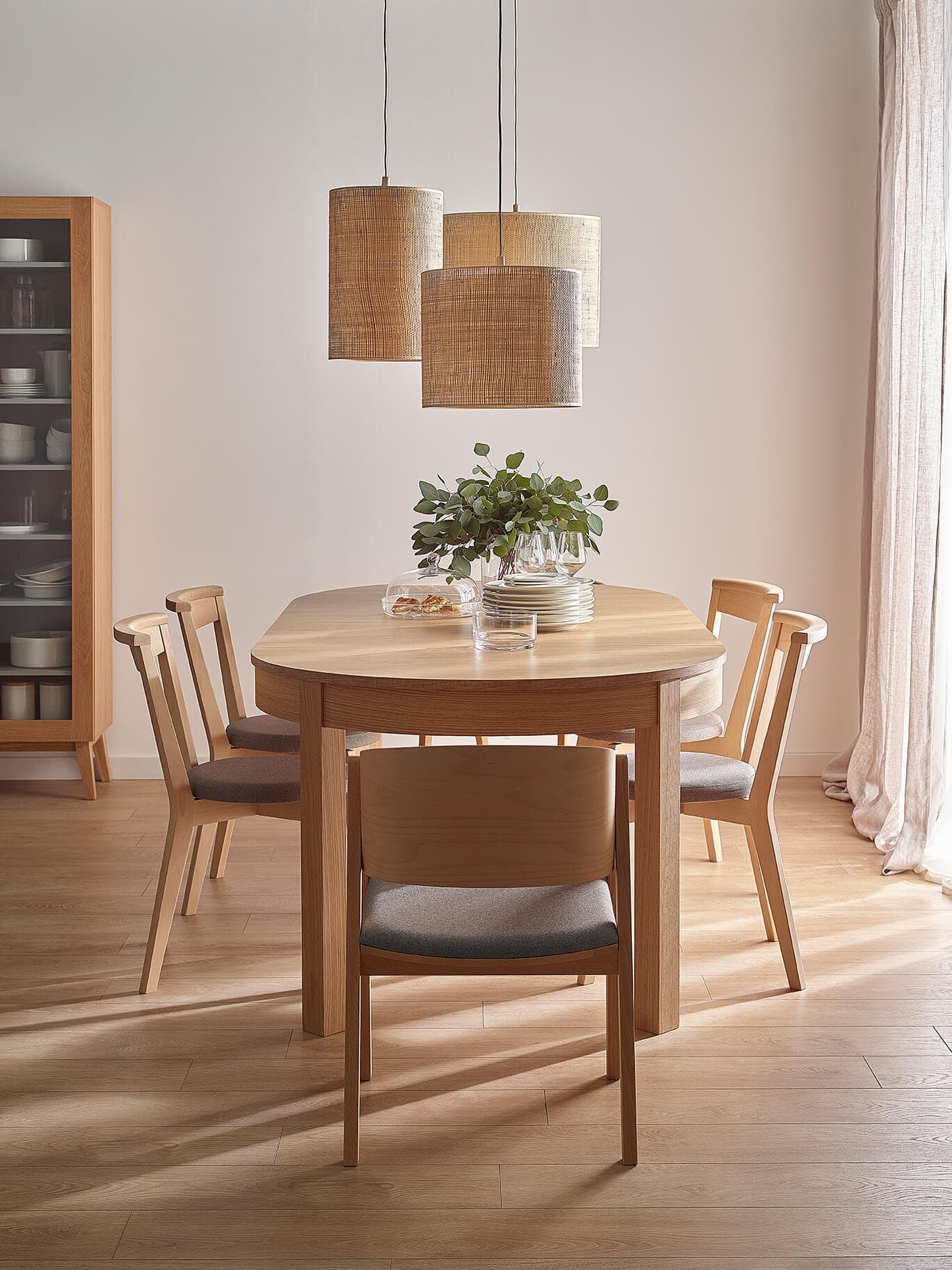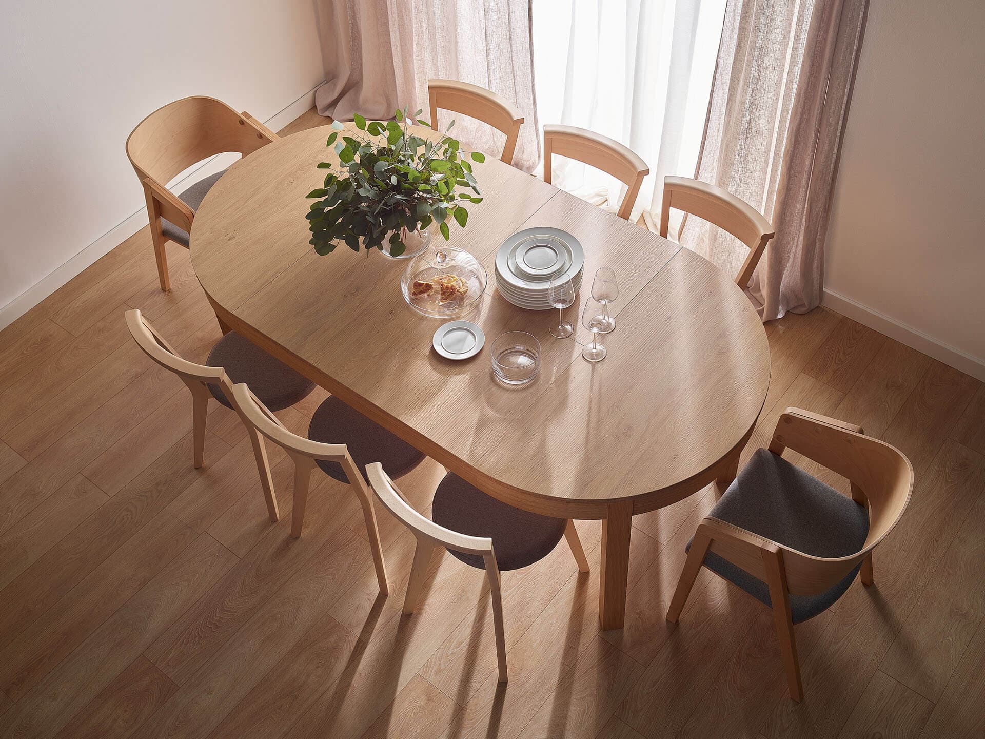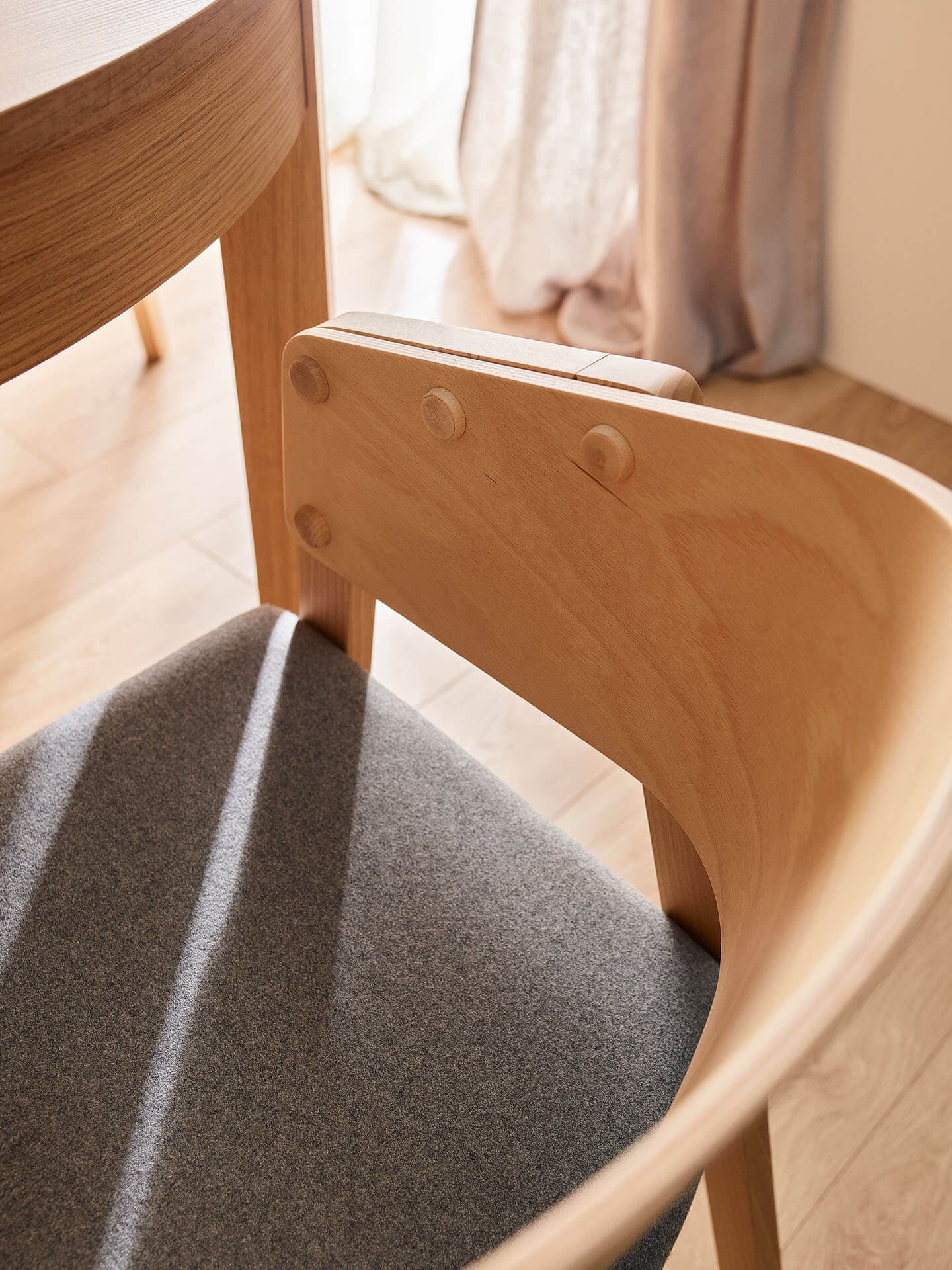 Do wykonania stelażu krzesła zastosowano wytrzymałe drewno bukowe. Gięte oparcie powstało ze sklejki, a siedzisko wykończone jest tkaniną składającą się w 40% z wełny, 32% z wiskozy i w 28% z poliestru.