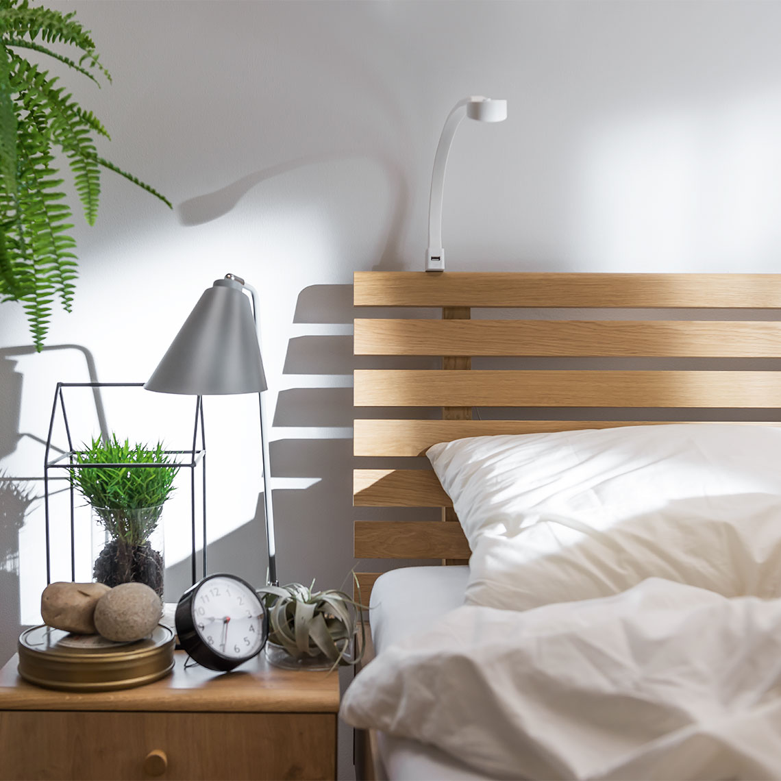 Lampkę ELASTIC mocuje się najczęściej do szczytów łóżka lub boków biurek za pomocą dwóch śrubek, które znajdują się w zestawie.