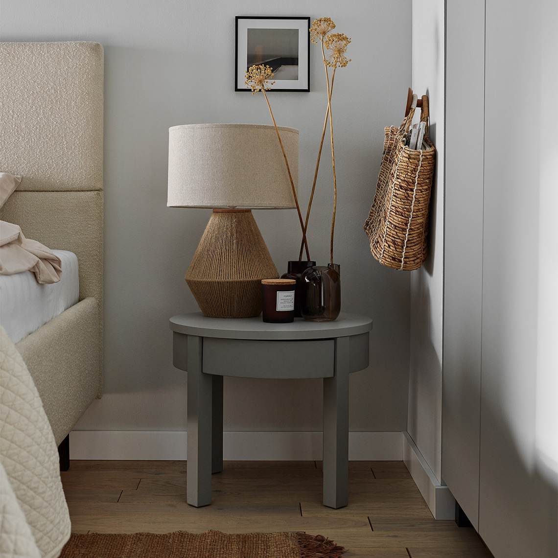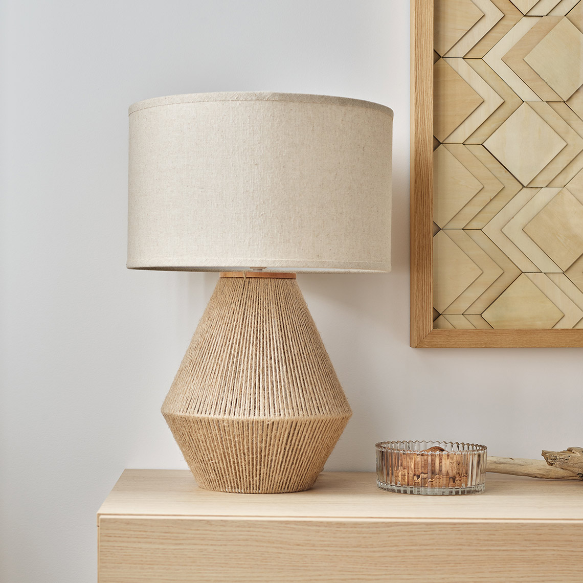 Podstawa lampy wykonana jest z jutowego sznurka, a abażur z tkaniny lnianej.
