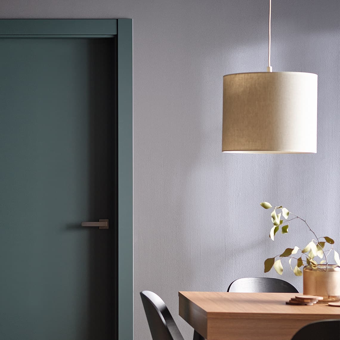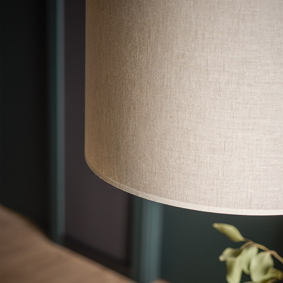 - Hitta to abażury lniane w jasnym odcieniu beżu.