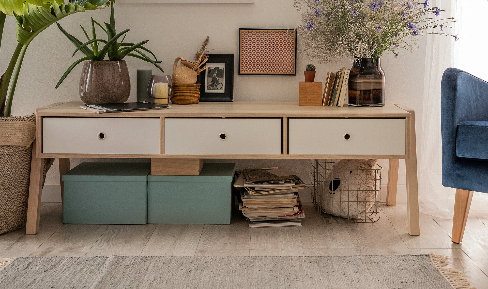 - 3 dołączone szuflady pozwalają na wypełnienie połowy wnęk. Opcjonalnie można dokupić dodatkowy zestaw szuflad i zyskać więcej miejsca do organizacji drobiazgów.