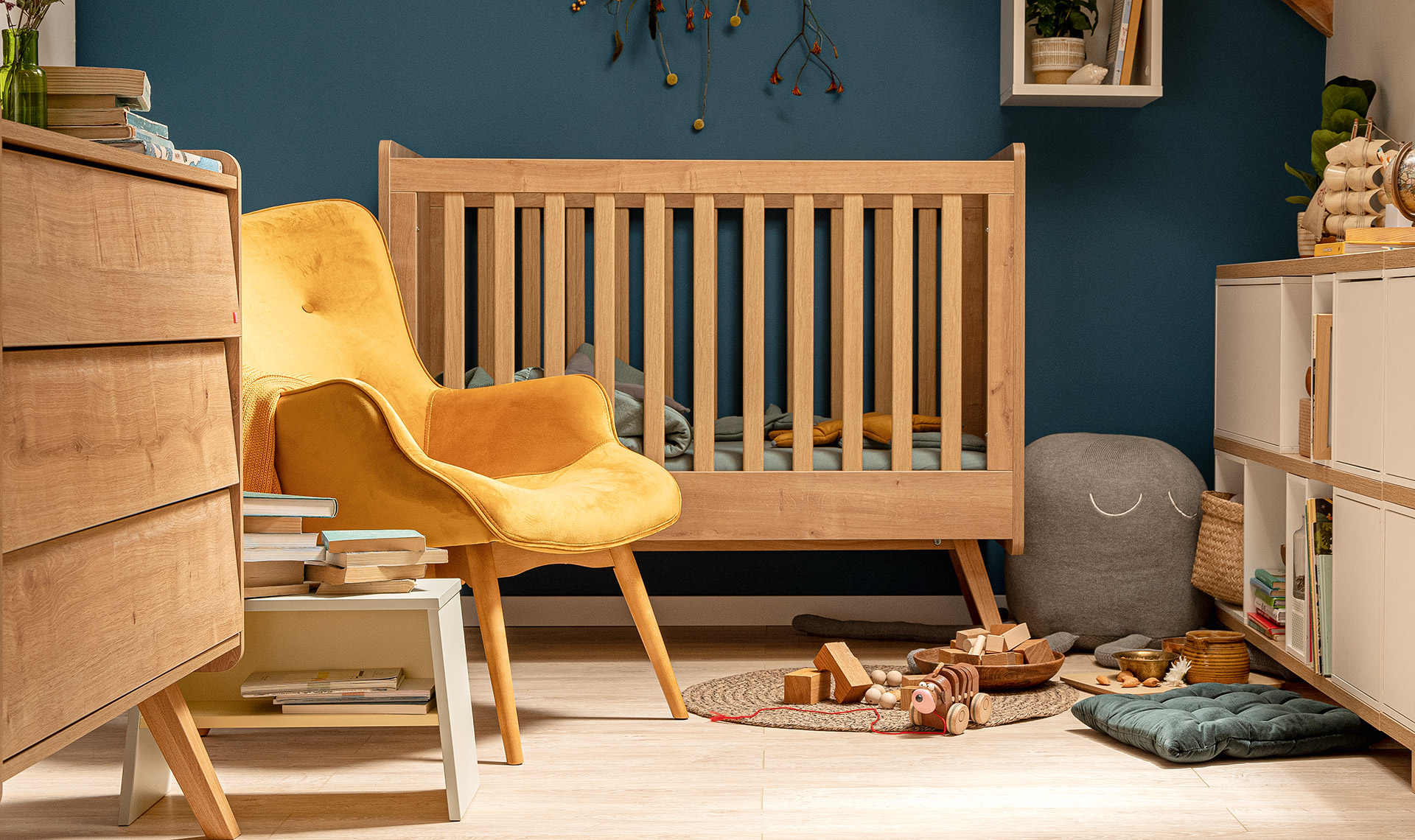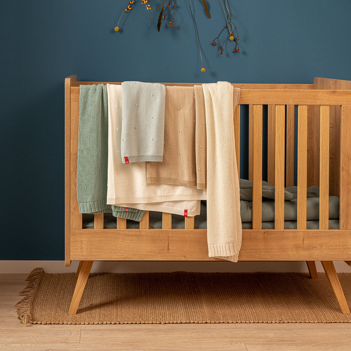 - Łóżeczko w kolorze dębowym.