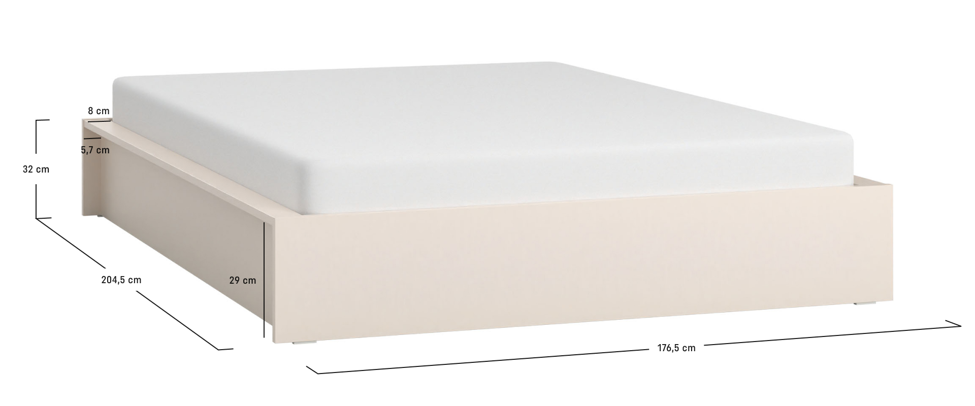 - Do łóżka można wybrać różne typy podłogi: montowane na stałe i uchylne stelaże, które zapewniają dodatkową przestrzeń do przechowywania pod materacem o wymiarach 200 x 160,2 x 20 cm.