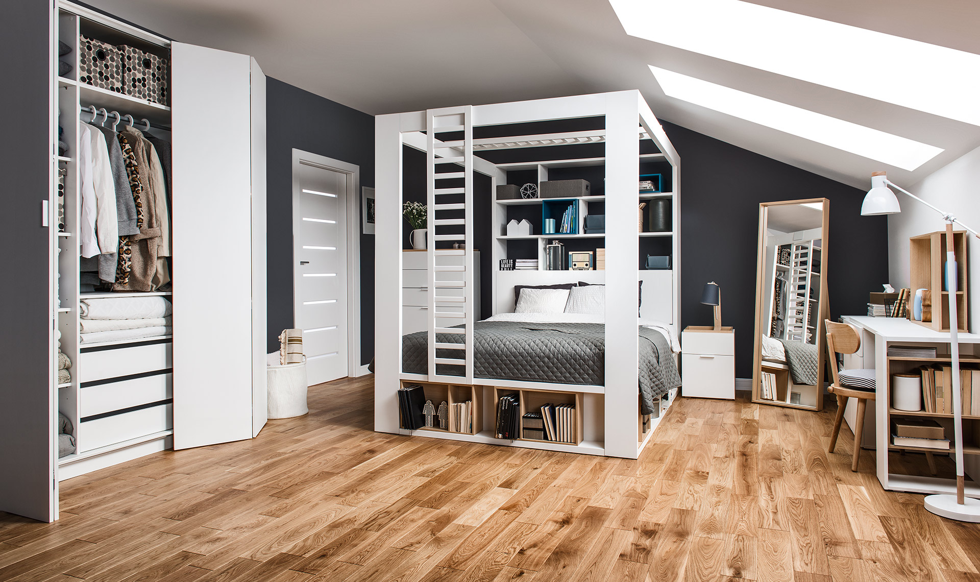 - Do wyboru masz dwa warianty łóżka: z podłogą lub z podnoszonym stelażem. Ten drugi sprawdzi się wtedy, gdy potrzebujesz dodatkowego schowka do przechowywania pościeli.