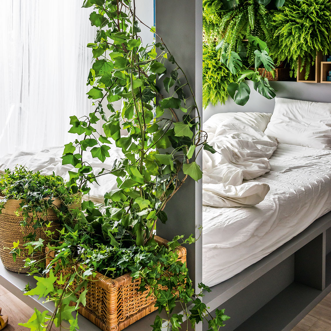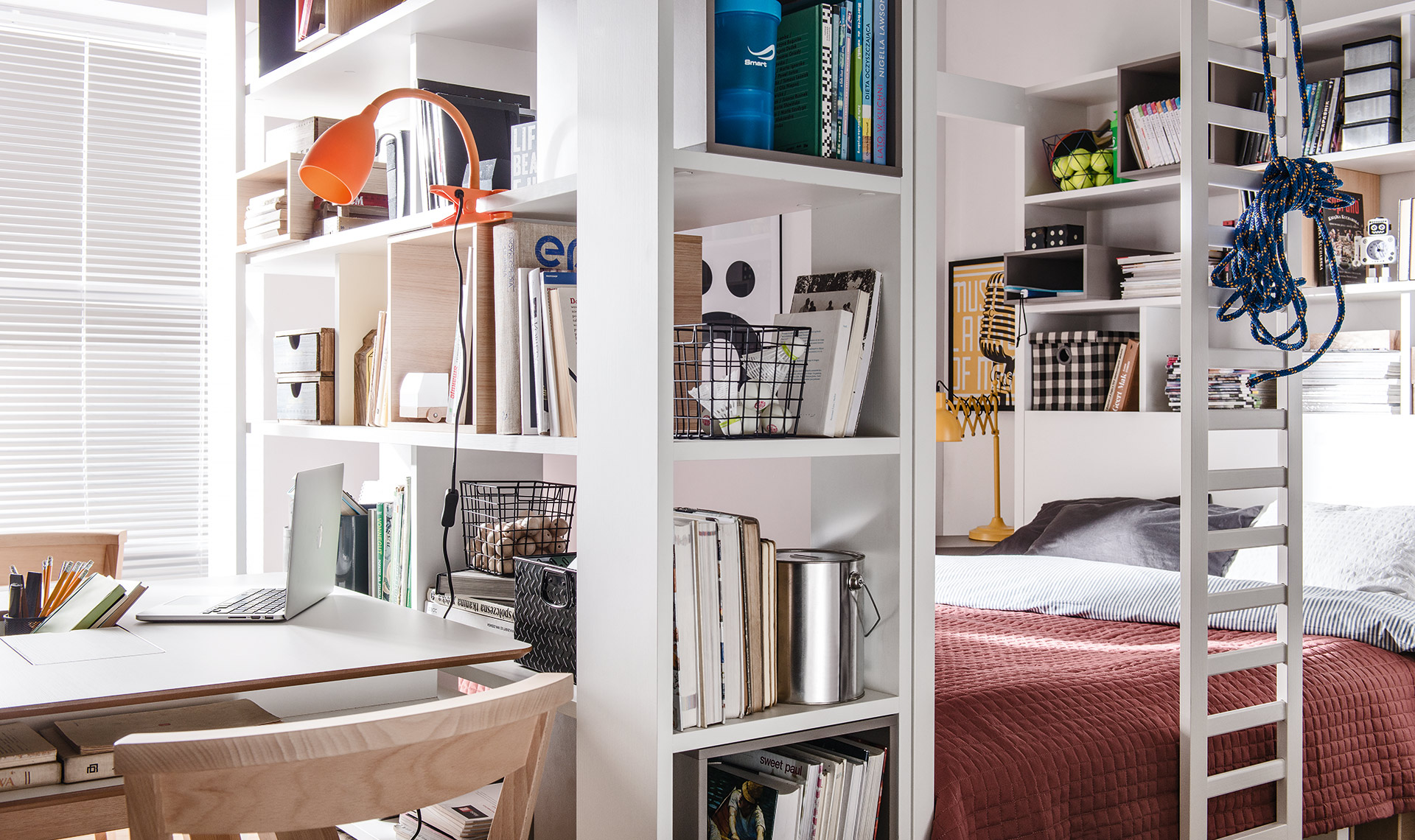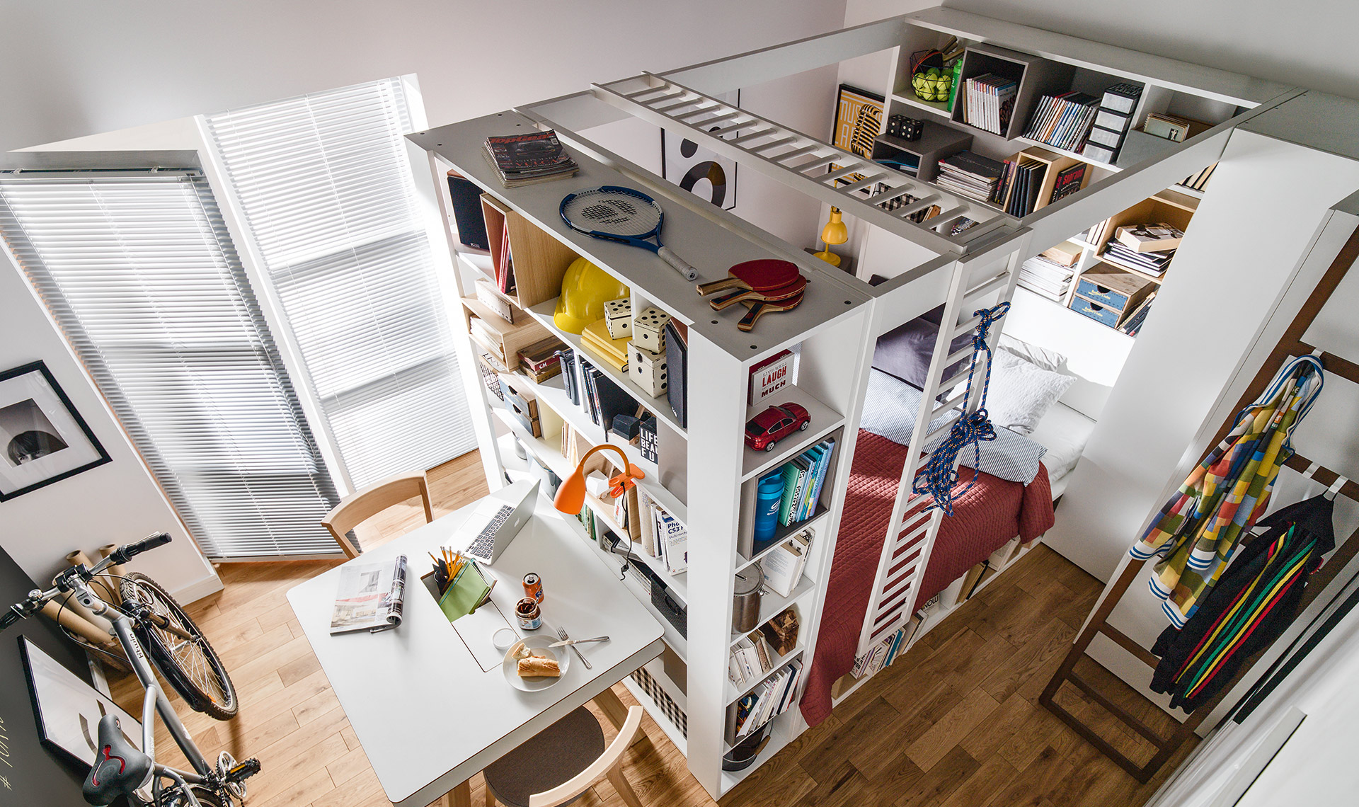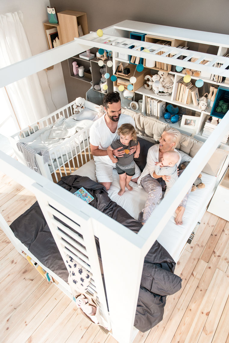 - Na zintegrowanym z łóżkiem baldachimie możesz powiesić tkaninę, by stworzyć własną, intymną przestrzeń lub osłonić się przed porannym słońcem. To także dobre miejsce, by zamontować na nim rozwijany ekran, na którym będziesz wyświetlać filmy za pośrednictwem podwieszonego pod sufitem projektora.