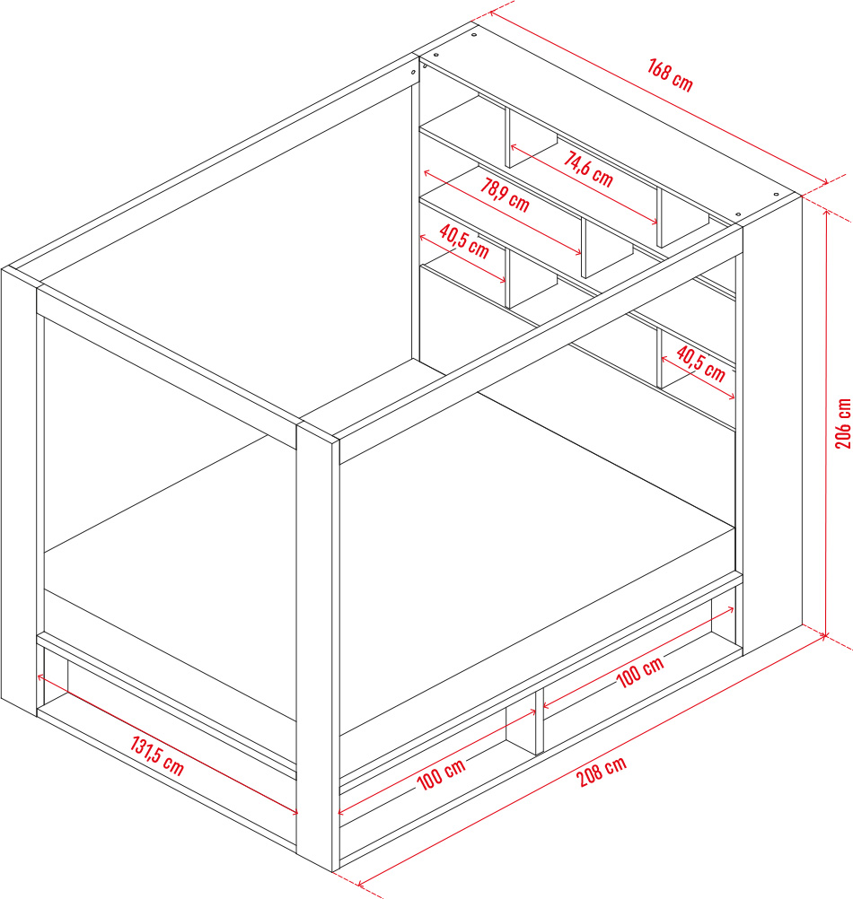 - Łóżko jest wyposażone w szereg otwartych półek, które są bardzo pojemne. Znajdują się zarówno na regale połączonym z zagłówkiem, jak i w stelażu, co zapewnia ogromne możliwości aranżacyjne.