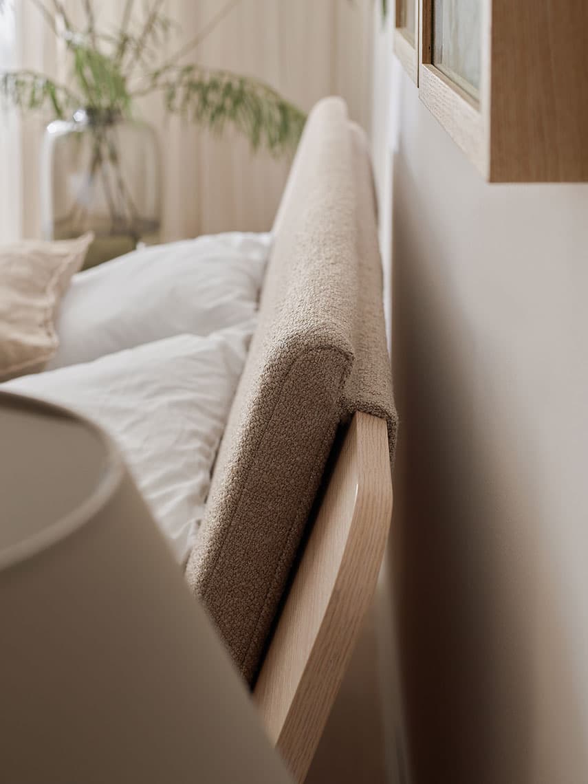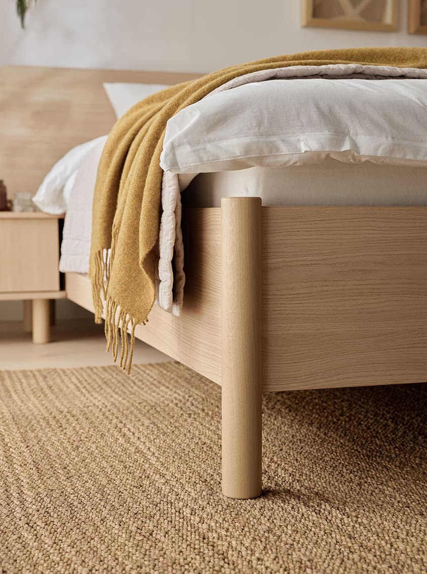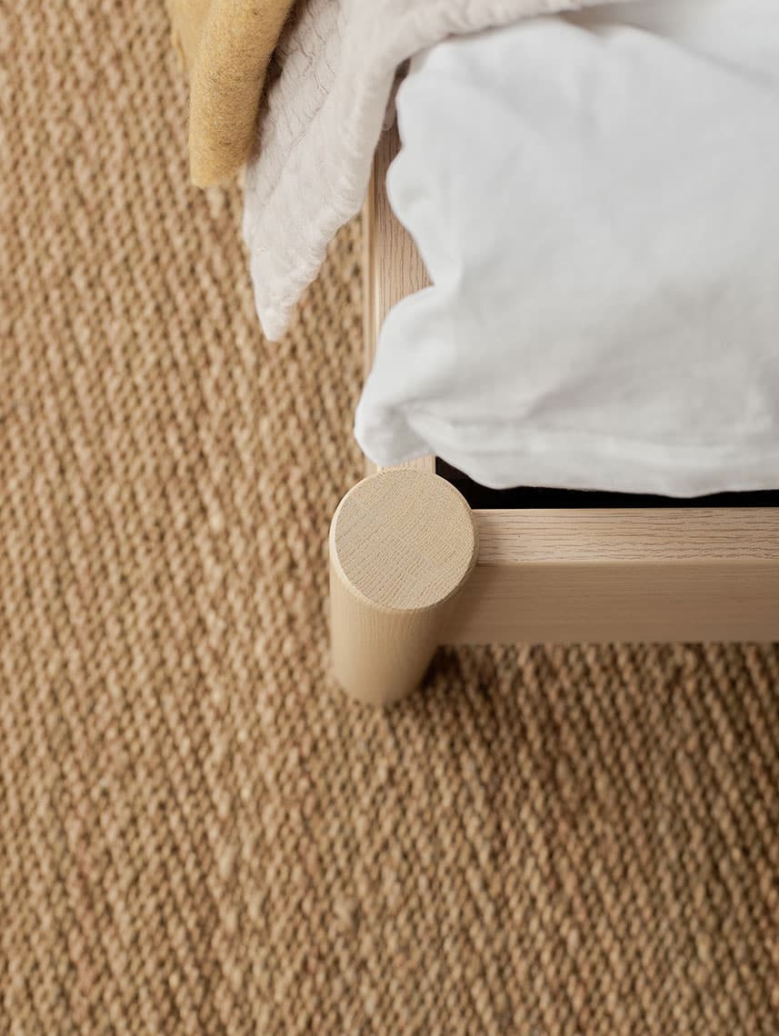 - Wysokie dębowe nogi w formie walca nadają meblowi lekkości i unikalnego charakteru. Dzięki nim łatwiej też o utrzymanie porządku w sypialni. U góry nóg znajduje się piękny detal.