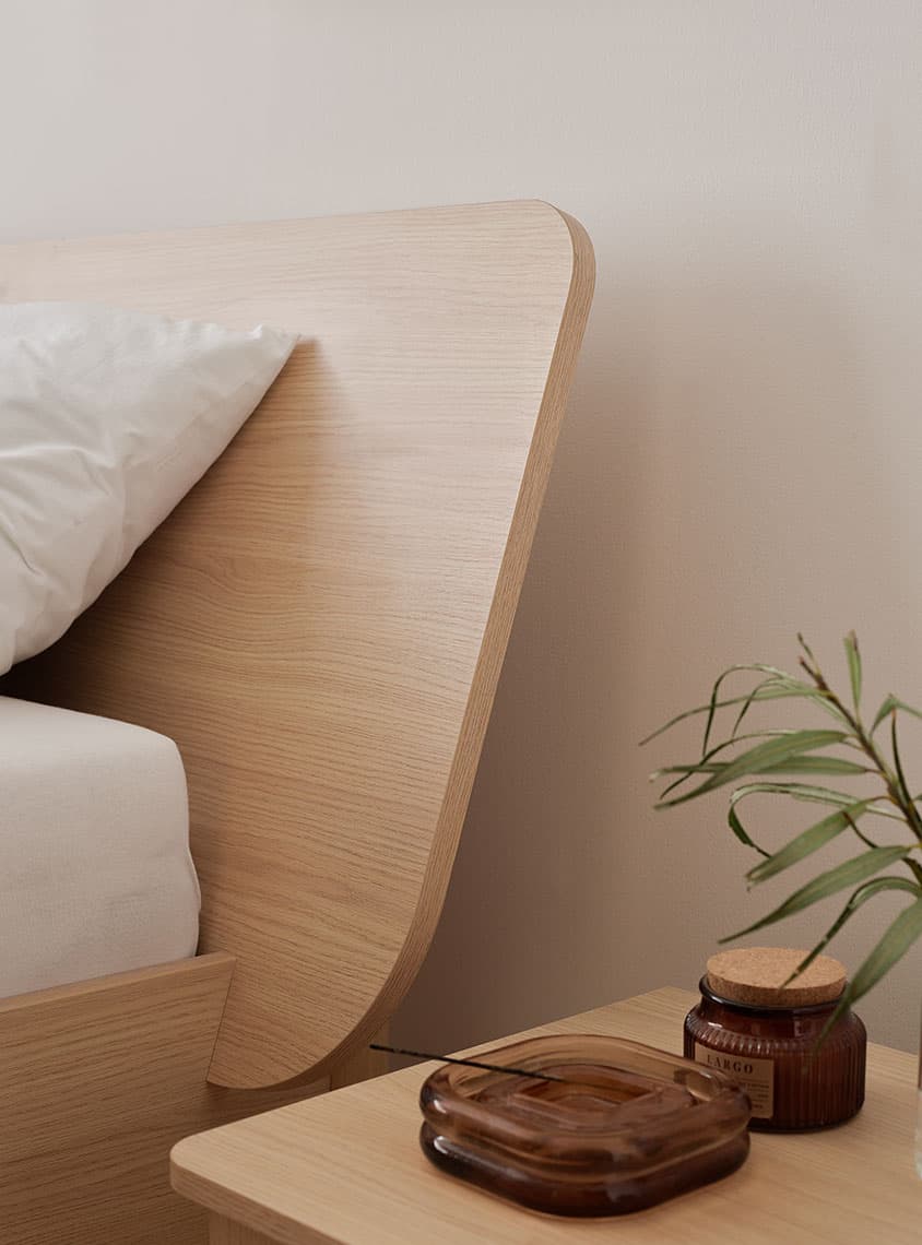 - Mebel posiada gładkie wezgłowie z miękko zaokrąglonymi brzegami, które wystaje poza ramę łóżka. Dzięki temu, że zamontowane jest pod lekkim kątem, opieranie się jest znacznie wygodniejsze. Wbudowany zagłówek ułatwia utrzymanie ściany w czystości.