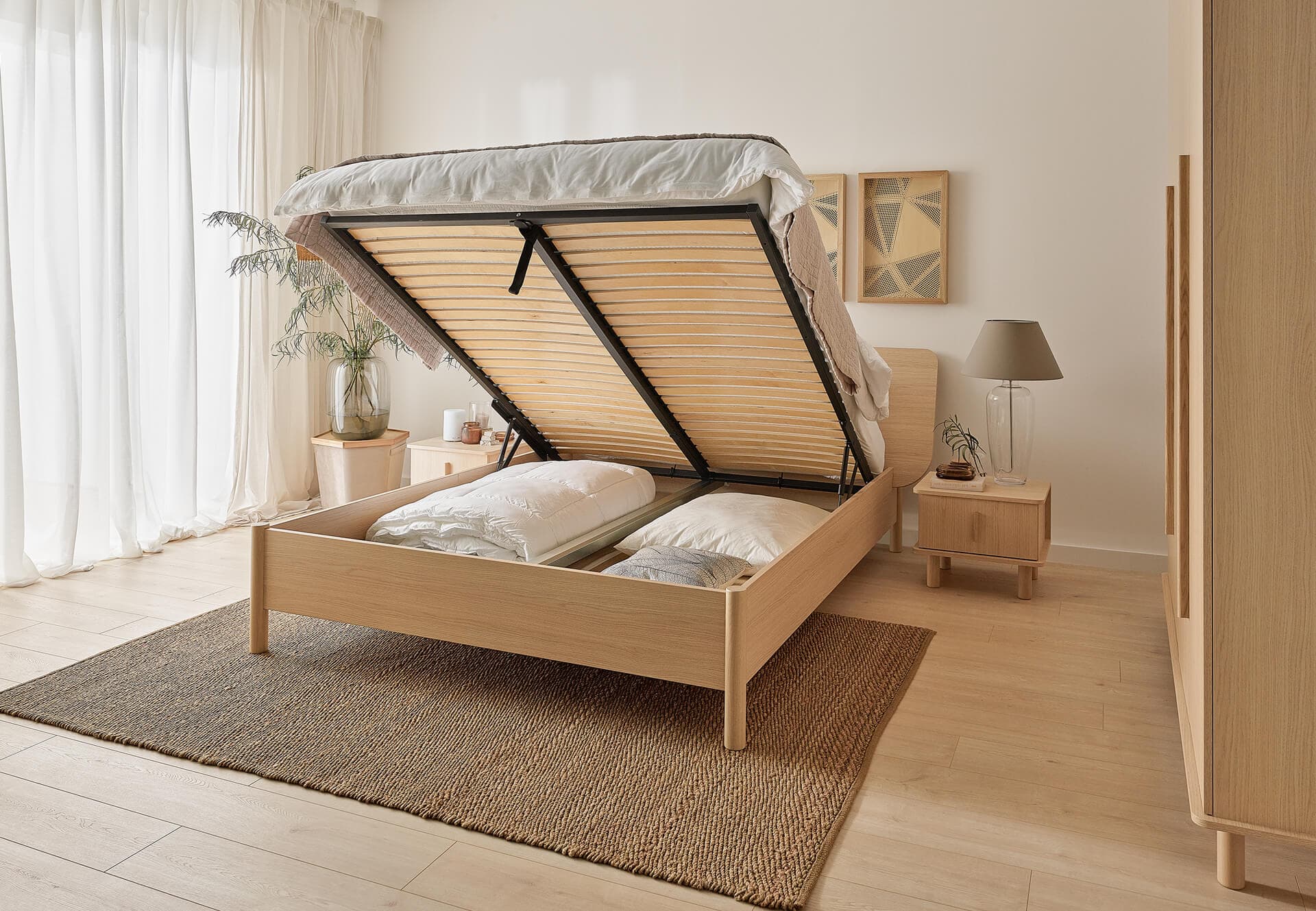 - Łóżko jest dostępne w kilku wersjach. Może posiadać stałą podłogę, elastyczną podłogę na taśmie lub podnoszony stelaż, za sprawą którego powstaje dodatkowa przestrzeń do przechowywania pod materacem o powierzchni: 202,3 x 160,2 x 11,3 cm. Sam materac należy dokupić zgodnie z własnymi preferencjami.